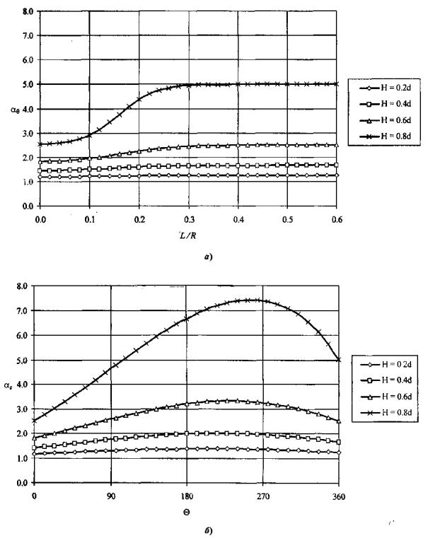 Уравнения состояния могут быть существенно сложнее введенных формулами (П2.21)-(П2.23), однако общим остается функциональная (иногда в виде дифференциальных уравнений) связь между напряжениями и деформациями в нагруженном теле. ПРИЛОЖЕНИЕ 3. КОНЦЕНТРАЦИЯ НАПРЯЖЕНИЙ В ТРУБЕ С ПОВЕРХНОСТНЫМИ ДЕФЕКТАМИП3.1. Распределение напряжений и деформаций на участке трубы с поверхностным дефектом (рис. 3.1) оказывается весьма сложным и зависящим от многих параметров (диаметр трубы, толщина стенки, размеры дефекта, кольцевые и продольные номинальные напряжения). Аналитическое решение в общем случае получить невозможно, поэтому был проведен конечноэлементный анализ в широком диапазоне соотношений размеров труб и дефектов (d/R = 0.015... 0.030; L/R = 0.01... 3.0; Q = 1...3600; H/d = 10...90%) отдельно для кольцевых и продольных напряжений. Примеры такого анализа в виде уровней концентрации напряжений при d/R = 0.02; L/R = 1.4; Q = 24°; H/d = 50 % приведен на рис. П3.1 для кольцевых (рис. П3.1, а) и продольных напряжений (рис. П3.1, б). Рис. П3.1. Пример конечноэлементного решения о распределении напряжений в области дефекта в виде коэффициентов концентрации напряжений: а - кольцевых; б - продольных П3.2. Уровень нагруженности можно охарактеризовать коэффициентами концентрации кольцевых aq и продольных az напряжений, возникающих в дефектной зоне: