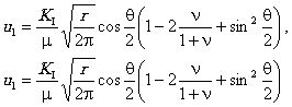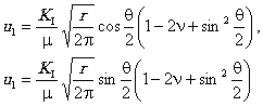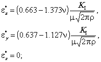ПРИЛОЖЕНИЕ 4. ОПРЕДЕЛЕНИЕ НАПРЯЖЕННО-ДЕФОРМИРОВАННОГО СОСТОЯНИЯ У ВЕРШИНЫ ТРЕЩИНЫ МЕТОДОМ ЛОКАЛЬНЫХ ДЕФОРМАЦИЙП4.1. В методе локальных деформаций [4, 5] считается, что процессы деформирования, накопления повреждений, разрушения происходят в некотором небольшом, но конечном объеме металла (здесь существует аналогия с понятием «структурного элемента»). В качестве такого «элементарного объема» принят мысленно выделенный в металле шар радиуса r; r - характерный размер, отражающий чувствительность металла к концентрации напряжений. Считается, что напряженно-деформированное состояние шара контролируется перемещениями иi (i = 1,2, 3) его границы S. По значениям перемещений вычисляются осредненные по объему производные ¶ui ¤ ¶xj и деформации В общем случае определение перемещений иi и деформаций eij* требует применения численных методов, однако при рассмотрении области вблизи вершины трещины возможны некоторые упрощения. П4.2. Для трещины нормального отрыва перемещения вблизи вершины определяются по формулам [7] для случая плоской деформации или для плоского напряженного состояния. Здесь К1 - коэффициент интенсивности напряжений, m - модуль упругости при сдвиге, n - коэффициент Пуассона, r и q - полярные координаты рассматриваемой точки. Если центр шара расположен на продолжении трещины на расстоянии r, то при подстановке (П4.3) или (П4.4) в (П4.1) и (П4.2) получим для e* при плоской деформации: