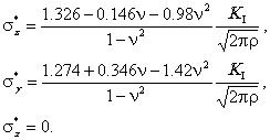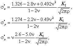 4.5.2. Далее расчет производится по пп. 4.4.2-4.4.7. 4.6. Продольная сквозная трещина (п. 3.6). 4.6.1. Условно-упругие компоненты напряжений рассчитываются по формулам (Приложение 4): где