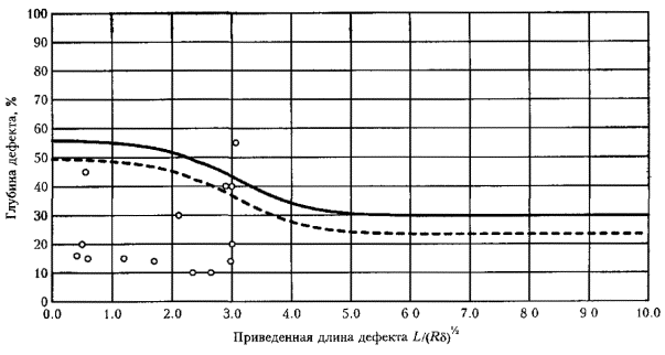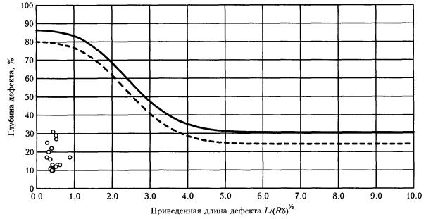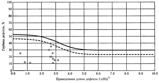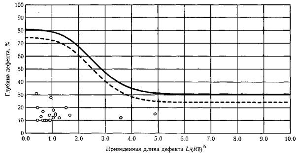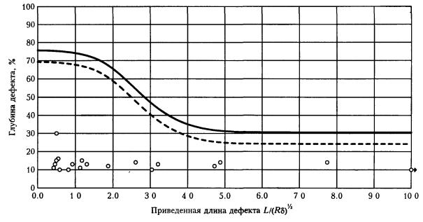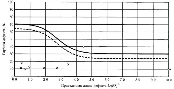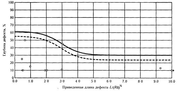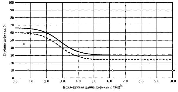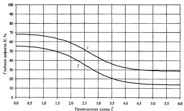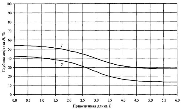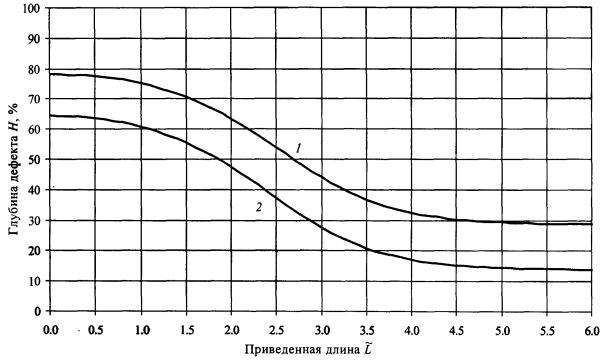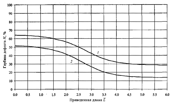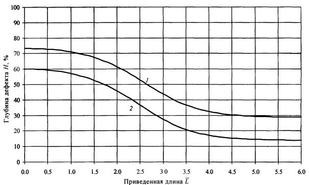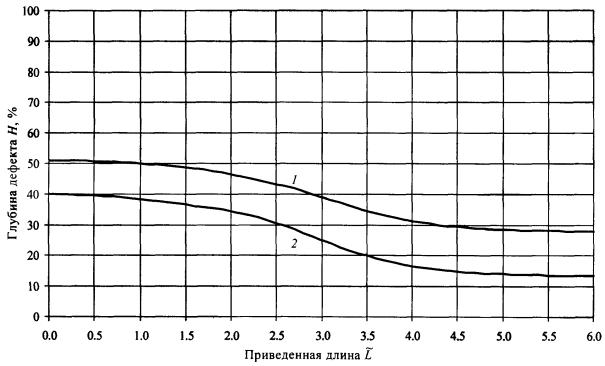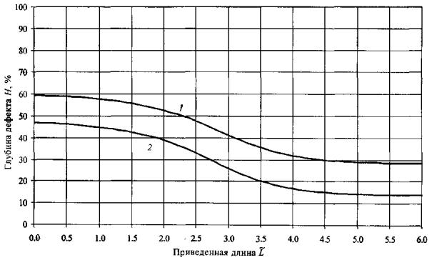 (безразмерная) длина дефекта по оси абсцисс - глубина дефекта в процентном отношении к толщине стенки. Рис. П6.1. Допускаемые размеры дефектов (ширина дефекта до 5°).