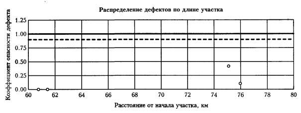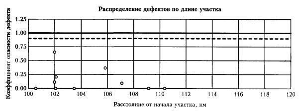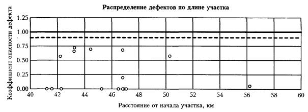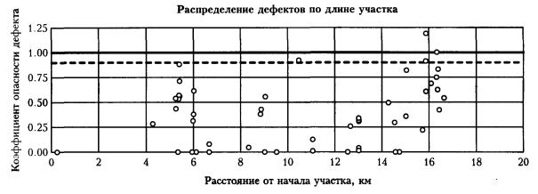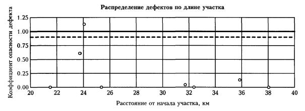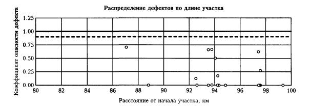 Рис. П9.2. Пример компьютерного анализа результатов внутритрубной дефектоскопии. Распределение дефектов с коэффициентами степени опасности по длине участка (окончание)