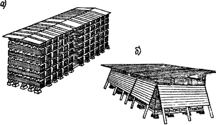 обрезного пиломатериала: 6.4. Изделия из дерева6.4.1. Окна и балконные двери (переплеты, дверные полотна, коробки, подоконные доски, фрамуги) изготовляют из древесины сосны, лиственницы, кедра, ели и пихты, а в помещениях, с нормальным температурно-влажностным режимом для изготовления внутренних дверей и фрамуг разрешается применять бук, березу, ольху, осину, тополь. 6.4.2. Окна и балконные двери должны поставляться изготовленными в соответствии с требованиями ГОСТа 23166-78, подоконные доски - по ГОСТ 17280-79, деревянные фрезерованные детали для строительства - по ГОСТ 8242-75. 6.4.3. Окна и балконные двери поставляют собранными в блоки, в состав которых входят коробки и вогнанные в них и навешенные на петли элементы их заполнения - створки, форточки, фрамуги, дверные полотна с врезанными приборами. 6.4.4. Лицевые стороны столярных изделий, а также стороны, сопрягаемые между собой, должны быть чисто простроганы, на столярных изделиях недопустимы покоробленность и перекосы более чем на 3 мм в любом направлении. На лицевой поверхности изделий не должно быть следов клея. Сучки и прочие механические повреждения должны быть заделаны вставками на клею, тщательно выполнены без щелей и зазоров. 6.4.5. На каждом изделии должен быть нанесен на нелицевой поверхности штамп ОТК предприятия и номер приемщика ОТК. 6.4.6. При перевозке окна и двери должны быть защищены от действия атмосферных осадков, а также от механических повреждений и загрязнения. 6.4.7. Оконные и дверные блоки следует хранить в вертикальном положении на подкладках в сухих проветриваемых помещениях, рассортированными по типам, размерам и сортам. При отсутствии в складском помещении пола изделия укладывают на специальные подкладки высотой 70 см. На рис.12 показан способ хранения столярных изделий. 6.4.8. Оконные и дверные блоки принимают поштучно по типам и маркам, в соответствии со спецификацией. Блоки подвергают наружному обмеру, а оконные переплеты и дверные полотна - по площади. Площадь определяют с точностью до 0,01 м2. На рис. 3 показан контейнер для транспортирования стеклодверей. Рис. 12. Складирование столярных изделий