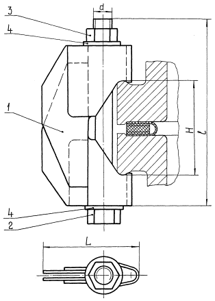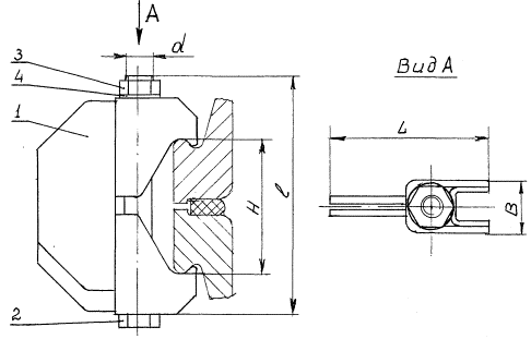 Приказом Всесоюзного промышленного объединения от 12 ноября 1983 г № 161 срок действия установлен с 01.01. 1985г. до 01.01. 1996г. (Измененная редакция, Изм. № 3). УТВЕРЖДЕН И ВВЕДЕН В ДЕЙСТВИЕ ПРИКАЗОМ Всесоюзного промышленного объединения «Союзхиммаш» от «___» ___________1983г. №__ ИСПОЛНИТЕЛИ: В. Ф. Ильченко, Л. М. Кулик, Л. А. Чернявская, Т. А. Новикова, Л. М. Хорунжая, О. П. Смищенко, А. К. Куркина СОГЛАСОВАН Министерством химической промышленности СССР Управление главного механика и главного энергетика Н. А. Жолудев 1. Настоящий стандарт распространяется на зажимы для соединение фланцев стальных и чугунных эмалированных аппаратов эксплуатируемых при температуре от минус 30 до плюс 300°С, а также аппаратов из углеродистых, легированных сталей и других металлов и сплавов при температуре от минус 70 до плюс 300°С. (Измененная редакция, Изм. № 1). 1а. Зажимы должны изготавливаться следующих типов: 1 - с цельноштампованными траверсами; 2 - со сварными траверсами. (Введен дополнительно, Изм. № 1). 2. Конструкция и размеры зажимов типа 1, их нагрузочная способность и податливость должны соответствовать указанным на черт. 1 и в табл. 1. 1 - траверса; 2 - болт по ОСТ 26-2037-77 или шпилька по ОСТ 26-2039-77 или ОСТ 26-2040-77; 3 - гайка по ОСТ 26-2038-77; 4 - шайба по ГОСТ 10450-78 или ОСТ 26-2042-77. Примечание. Допускается применять болт по ГОСТ 7805-70 и ГОСТ 15590-70. Черт. 1 Размеры в мм