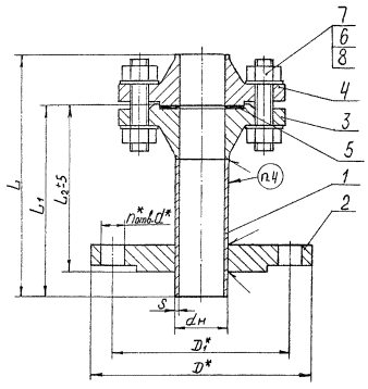 Приказом Срок действия установлен От 28.02.75 г. № 18 с 01.01. 1976 г. до 01.01. 1993 г. (Измененная редакция, Изм. № 1, 2, 3). 1. Настоящий стандарт распространяется на вводы-выводы труб с фланцами приварными в стык стальных сварных сосудов и аппаратов на условное давление от 6 до 63 кгс/см2 (от 0,6 до 6,3 МПа), вакуум с остаточным давлением не ниже 667 Па (5 мм рт. ст.) и температуру от минус 70 до плюс 530°С, изготавливаемых в подотрасли химического машиностроения. (Измененная редакция, Изм. № 3). 2. Стандарт устанавливает конструкции вводов-выводов труб двух типов: 1 - вводы-выводы труб с фланцами с выступом-впадиной приварными в стык на Ру от 6 до 63 кгс/см2 (от 0,6 до 6,3 МПа); 2 - вводы-выводы труб с фланцами с шипом-пазом приварными в стык на Ру от 6 до 63 кгс/см2 (от 0,6 до 6,3 МПа). (Измененная редакция, Изм. № 2). 3. Конструкция и размеры вводов-выводов труб типов 1, 2 должны соответствовать указанным на черт.1, 2 и в табл.1, 2, 3, 4, 5, 6. Тип 1 1. Патрубок - без чертежа 2. Фланец типа 2 - по ОСТ 26-01- 3. Фланец исполн. 3 - по ГОСТ 12821-80 4. Фланец исполн. 2 - по ГОСТ 12821-80 5. Прокладка типа Б - по ГОСТ 15180-70 6. Шпилька - по ОСТ 26-2040-77 7. Гайка - по ОСТ 26-2041-77 8. Шайба - по ОСТ 26-2042-77 (только для Ру 40 и 63 кгс/см2) (Измененная редакция, Изм. № 1, 2). Черт. 1 ТИП 2 1. Патрубок - без чертежа. 2. Фланец типа 3 - по ОСТ 26-01- 3. Фланец исполн. 5 - по ГОСТ 12821-80 4. Фланец исполн. 4 - по ГОСТ 12821-80 5. Прокладка типа В - по ГОСТ 15180-70 6. Шпилька - по ОСТ 26-2040-77 7. Гайка - по ОСТ 26-2041-77 8. Шайба - по ОСТ 26-2042-77 (только для Ру 40 и 63 кгс/см2) (Измененная редакция, Изм. № 1, 2). Черт. 2 Ру 6 кгс/см2 (0,6 МПа) Размеры в мм