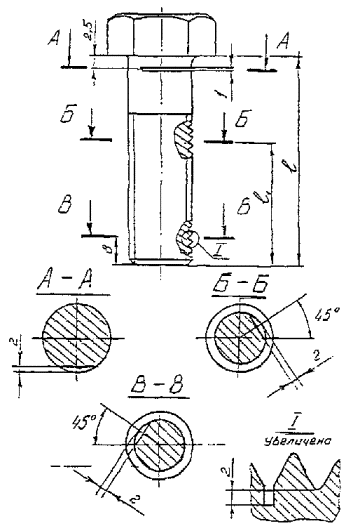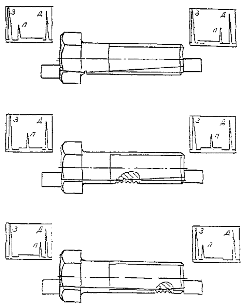 Обозначения: dS - толщина соединяемого пакета; Р0 - проектная площадь сечения элемента БнЗС; i - уклон к оси болта (заклепки); МP и МФ - фактический и расчетный момент на ключе; 3 - заклепки; Б - болты с неконтролируемым натяжением; БК - болты с контролируемым натяжением; БФ - болты фланцевых соединений; NС - количество болтов (заклепок) в соединении. Приложение 4МЕТОДИКА УЛЬТРАЗВУКОВОГО КОНТРОЛЯ БОЛТОВ1. Общие положения 1.1. Настоящая методика распространяется на УЗК болтов диаметром 16-32 мм и длиной 60-170 мм. 1.2. Методика предусматривает проведение УЗК эхо-методом прямыми совмещенными ПЭП с рабочий частотой 2,0-2,5 МГц. Контроль проводят контактным способом, перемещая ПЭП вручную. 1.3. Болты, проверенные УЗК и признанные годными, клеймятся личным клеймом дефектоскописта. 2. Организация контроля 2.1. УЗК должны проводить предприятия (организации), имеющие лицензии Госгортехнадзора России на экспертное обследование ГПМ или на контроль неразрушающими (ультразвуковыми) методами металла и сварных соединений. 2.2. Для проведения неразрушающего контроля на предприятии (в организации) рекомендуется создать лабораторию, которая должна удовлетворять требованиям соответствующих НД. 2.3. Места контроля должны быть оснащены средствами защиты от ярких источников света (постов электросварки, резки и т.п.); при контроле на открытом месте в дневное время или при сильном искусственном освещении необходимо принять меры к затемнению экрана дефектоскопа. В необходимых случаях для обеспечения безопасного и удобного взаимного расположения дефектоскописта, аппаратуры и контролируемого участка конструкции следует устанавливать леса, подмостки, лестницы или использовать люльки. 2.4. Для работы в труднодоступных местах и на высоте в помощь дефектоскописту должен быть выделен вспомогательный персонал. 3. Квалификация персонала 3.1. К руководству работами допускаются специалисты, прошедшие проверку знаний Правил ПБ 10-14-92 в соответствии с Положением о порядке проверки знаний правил, норм и инструкций Госгортехнадзора России. 3.2. К выполнению контроля допускаются дефектоскописты, прошедшие аттестацию в соответствии с Правилами аттестации специалистов неразрушающего контроля, утвержденными Госгортехнадзором России 18.08.92г. 4. Средства контроля 4.1. При контроле следует применять импульсные УЗ дефектоскопы, удовлетворяющие требованиям соответствующих НД; прямые совмещенные ПЭП, удовлетворяющие требованиям ГОСТ 26266. Кроме того дефектоскопы должны иметь глубиномеры и блоки ВРЧ. 4.2. В качестве СОП используется болт размеры и материал которого соответствуют контролируемым болтам. В СОП изготавливают искусственные отражатели типа пропилов в местах наиболее вероятных разрушений (рис. 2), а именно: под головкой болта, под гайкой и вместе окончания резьбы. Надрезы выполняются на фрезерном станке глубиной 2 мм. 4.3. Для обеспечения проведения УЗК в различных пространственных положениях лаборатория должна иметь набор контактных смазок для создания акустического контакта, включающий трансформаторное масло, глицерин, ЦИАТИМ и смазки. 5. Подготовка к контролю 5.1. Перед началом работы дефектоскопист обязан ознакомиться с конструкцией узлов болтовых соединений, получить схему узлов соединений с указанием порядковых номеров контролируемых болтов, произвести наружный осмотр до