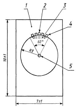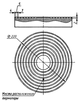 Рисунок Б.1 - Расположение буковых брусков для проведения испытаний ПРИЛОЖЕНИЕ В(обязательное) ТЕСТОВЫЙ ОЧАГ ПОЖАРА ТП-2 (ТЛЕНИЕ ДРЕВЕСИНЫ)При проведении испытаний в качестве горючего материала используется 10 высушенных буковых брусков размерами 75´25´20 мм, расположенных на поверхности электрической плиты диаметром 220 мм, имеющей 8 концентрических пазов глубиной 2 мм и шириной 5 мм. Внешний паз должен располагаться на расстоянии 4 мм от края плиты, расстояние между смежными пазами должно составлять 3 мм. Вид рабочей поверхности электрической плиты представлен на рисунке B.1. При проведении испытаний напряжение, подаваемое на электроплиту, должно обеспечивать подъем температуры на поверхности плиты до 600°С за 660 с. Контроль температуры на поверхности плиты осуществляют термопарой, закрепленной с хорошим тепловым контактом в пятом пазе (считая от края плиты). Конец испытаний: m - 2 дБ/м. Контролируемые параметры в конце испытаний: