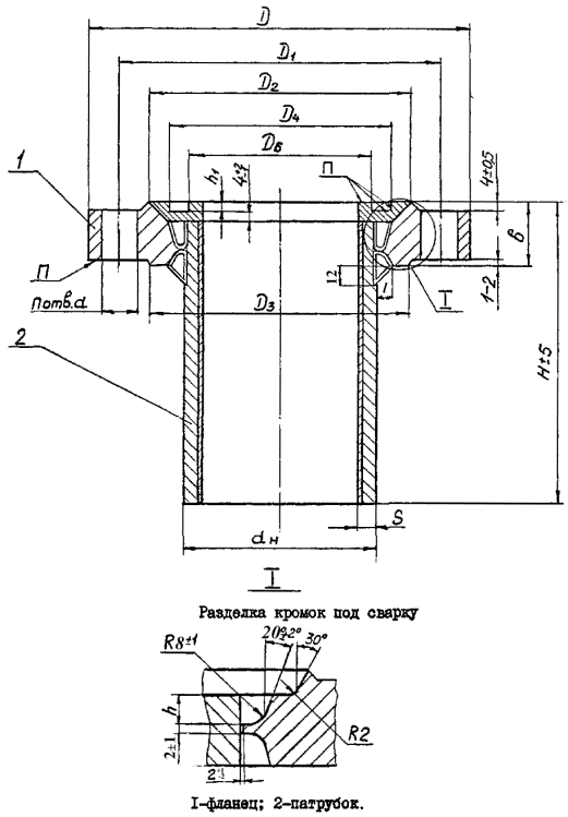 (Срок действия продлен. Изм. № 2) Несоблюдение стандарта преследуется по закону 1. Настоящий стандарт распространяется на штуцера из двухслойных сталей с плоскими приварными фланцами с наплавленной уплотнительной поверхностью с пазом на условный проход Ду от 150 до 600 мм, условное давление Ру 1,6 и 2,5 МПа (16 и 25 кгс/см2) и температуру от минус 60 до 475°С. (Измененная редакция. Изм. № 1) 2. Конструкция и размеры штуцеров должны соответствовать указанным на чертеже и в табл. 1-2. 3. Материал, технические требования и маркировка штуцеров по ОСТ 26-02-2053-79.