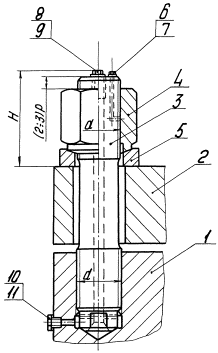 Приказом Всесоюзного производственного объединения Союзхиммаш № 173 от 30 октября 1981 г. срок действия с 01.07.1982 г. до 01.01.1997 г. Настоящий стандарт распространяется на резьбовые соединения для сосудов и аппаратов, применяемых в химической, нефтехимической и смежных отраслях промышленности на давление свыше 9,81 до 98,1 МПа (свыше 100 до 1000 кгс/см2) и при расчетной температуре стенки сосуда от минус 40 до плюс 420 °С. (Измененная редакция, Изм. № 1, 2). 1. Стандарт устанавливает следующие типы резьбовых соединений: Тип А - для затяжки фланцевого соединения ключом гаечным; Тип Б - для затяжки фланцевого соединения гидродомкратом с захватом шпильки за основную резьбу; Тип В - для затяжки фланцевого соединения гидродомкратом с захватом шпильки за резьбовой хвостовик. 2. Типы и размеры резьбовых соединений должны соответствовать указанным на черт. 1 - 3 и в таблице. 3. Соединение типа А применять только для диаметров резьб до М64×6 включительно. Допускается применять резьбовое соединение типа А диаметром резьбы больше М64×6 в случаях, когда невозможна установка на шпильке гидродомкрата (мешает патрубок и т. д.). 4. Допускается изготавливать шпильки без центрального осевого отверстия при условии выполнения дренажных отверстий во фланце корпуса сосуда или аппарата. 5. Выбор исполнения конструкции дренажных отверстий в шпильке или во фланце определяется экономическими факторами изготовления и технологическими возможностями заводов-изготовителей. СОЕДИНЕНИЕ ТИПА А 1 - фланец; 2 - крышка; 3 - шпилька; 4 - гайка; 5 - шайба; 6 - болт М10×1,25×14,58 ГОСТ 7798-70; 7 - шайба 10,01 ГОСТ 11371-78 (СТ СЭВ 280-76, СТ СЭВ 281-76); 8 - болт М14×1,5×20,58 (М20×1,5×25,58) ГОСТ 7798-70; 9 - шайба 14,01 (20,01) ГОСТ 11371-78 (СТ СЭВ 280-76, СТ СЭВ 281-76); 10 - болт М10×1,25×16,56 ГОСТ 7798-70, 11 - шайба 10,01 ГОСТ 11371-78 (СТ СЭВ 280-76, СТ СЭВ 281-76). Черт. 1. (Измененная редакция, Изм. № 1). СОЕДИНЕНИЕ ТИПА Б 1 - фланец; 2 - крышка; 3 - шпилька; 4 - гайка; 5 - шайба; 6 - колпачок защитный; 7 - болт М10×1,25×16,58 ГОСТ 7798-70; 8 - шайба 10,01 ГОСТ 11371-78 (СТ СЭВ 280-76, СТ СЭВ 281-76). Черт. 2. (Измененная редакция, Изм. № 1). СОЕДИНЕНИЕ ТИПА В 1 - фланец; 2 - крышка; 3 - шпилька; 4 - гайка; 5 - шайба; 6 - колпачок защитный; 7 - болт М10×1,25×16,58 ГОСТ 7798-70; 8 - шайба 10,01 ГОСТ 11371-78 (СТ СЭВ 280-76, СТ СЭВ 281-76). Черт. 3. (Измененная редакция, Изм. № 1). РАЗМЕРЫ РЕЗЬБОВЫХ СОЕДИНЕНИЙ мм