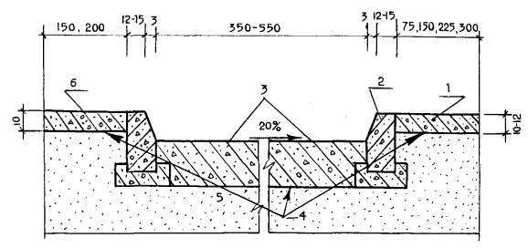 Дозаторы добавок устанавливаются на отечественных серийно выпускаемых автобетоносмесителях СБ 92. Рабочие чертежи дозатора добавок, в том числе всесезонного, разработаны по техническим требованиям НИИМосстроя. 1.4. Литьевая технология устройства дорожных конструкций может быть применена при положительной и отрицательной (до -15°С) температурах наружного воздуха. При отрицательных температурах наружного воздуха строительство конструкций следует выполнять из бетонной смеси, модифицированной комплексными добавками: противоморозными и суперпластификаторами. 2. КОНСТРУКЦИИ2.1. Дорожные конструкции из литой бетонной смеси могут назначаться с учетом требований альбома института Мосинжпроект СК 6101-86 и имеют некоторые особенности. Конструкция дорожных одежд с покрытием из литой бетонной смеси включает следующие элементы: - песчаный подстилающий слой; - основание; - полиэтиленовая пленка или пергамин; - бортовой камень; - бетонное покрытие. Конструкции дорожных одежд, выполненных с применением литого бетона, приведены на рис. 1. 2.2. Толщина конструктивных слоев принимается по проекту в зависимости от типа и назначения городских улиц и дорог, тротуаров и площадок (приложение 1). Покрытия из литых бетонных смесей на магистральных и скоростных улицах и дорогах устраивают на основаниях из укатываемого бетона класса по прочности В7,5 - В15 или из щебеночных уплотняемых смесей, отвечающих требованиям ТУ 400-24-150-86. ЗЕМЛЯНОЕ ПОЛОТНО Рис. 1. Дорожные конструкции с покрытием из литых бетонных смесей: 1 - бетонное покрытие тротуара; 2 - бортовой камень; 3 - бетонное покрытие дороги; 4 - пергамин, полиэтиленовая пленка; 5 - песок, 6 - бетонная отмостка Примечание: В случае устройства основания под бетонное покрытие из щебня или укатываемого бетона пергамин иди полиэтиленовая пленка не укладывается 2.3. В бетонных покрытиях дорог и улиц устраивают поперечные швы расширения в свежеуложенном бетоне (рис. 2а, б, в; 5), поперечные и продольные швы сжатия в свежеуложенном (рис. 2г, 3, 4) или твердевшем бетоне. При движении автотранспорта, в состав которого входит более 30% автомобилей грузоподъемностью 5 т и выше, выполняют шов расширения, представленный на рис. 2а, б, менее 30% автомобилей - устраивают шов расширения, показанный на рис. 2б. В основаниях из укатываемого бетона через 40-50 метров нарезают поперечные швы сжатия. 2.4. При строительстве дорог и тротуаров вокруг жилых зданий и объектов культурно-бытового назначения, благоустройстве территорий температурные швы расширения не устраиваются. 2.5. В основаниях дорог из литых бетонных смесей и покрытиях тротуаров поперечные швы устраивают по типу швов сжатия (рис. 2, 4) или нарезают в отвердевшем бетоне. 2.6. В конце рабочей смены устраивают поперечный температурный шов. Если рабочий шов расположен вблизи шва расширения (не более чем 6 м) в месте, предусмотренном проектом, он выполняется по типу шва расширения. В противном случае рабочий шов устраивают в виде упорной доски толщиной 5 см или металлического шаблона, обернутых пергамином, на полную ширину и высоту укладываемой полосы дороги. Закрепляется доска (шаблон) к грунту и бетону с помощью металлических штырей. Перед возобновлением работ установленная доска (шаблон) снимается. 2.7. В швах расширения покрытий дорог применяют прокладки из синтетических материалов, резины