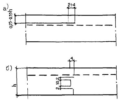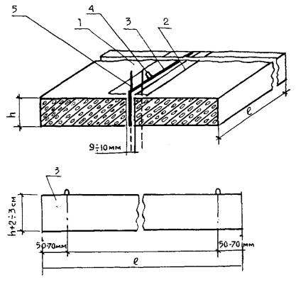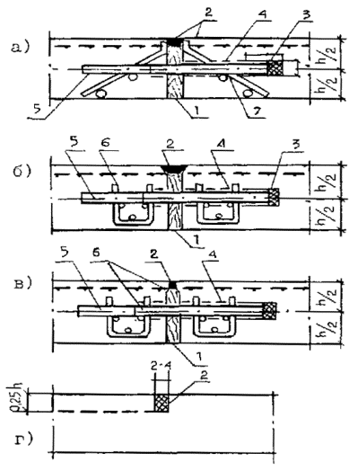 Рис. 2. Конструкции температурных швов: 1 - деревянный брусок сеч. 2-2,5х18; 2 - мастика; 3 - колпачок d=8 см; 4 - обмазка битумом стержня; 5 - штырь; 6 - корзинка; 7 - упорный каркас из Ст. 3 Ø 6 мм Швы расширения, устраиваемые в свежеуложенном бетоне: а) с кромкой из металлических полос, прикрепляемых так же как и штыри к упорному каркасу; б) с каркасом-корзинкой из Ст. Ø 5-8 мм, к которому крепятся штыри; в) нарезка шва производится в затвердевшем бетоне; г) шов сжатия Рис. 3. Конструкции продольные швов: а) продольный шов по типу ложного; б) продольный шов шпунтового типа ширина укладываемой полосы Рис. 4. Температурный шов в основаниях и покрытиях дорог и тротуаров: 1 - бетон; 2 - толь; 3 - металлический шаблон толщиной 4 - 5 мм; 4 - петли; 5 - штырь Штыри имеют длину 50 см, диаметр 2,5 см. 2.9. Штыри и прокладки прочно закрепляют на месте установки с помощью каркасов-корзинок или упорных каркасов из арматуры диаметром 8 мм. 2.10. На скоростных дорогах и магистральных улицах общегородского и районного значения в бетонных покрытиях и основаниях под асфальтобетонное покрытие армируют верхнюю зону сварными сетками из стальной арматуры, отвечающими требованиям ГОСТ 8478-81*. Сварные рулонные сетки шириной 2300 и 2500 мм с размером ячеек 100 и 200 мм, диаметр стержней которых равен соответственно 3 и 5 мм, укладывают с перекрытием 15 см. У поперечных швов сетки не доходят до швов на 10-15 см. 2.11. Попадающие в зону строительства дорог дождеприемные и смотровые колодцы должны устраиваться так, чтобы верх дождеприемных решеток был на 2 см ниже, а крышка люков находилась на отметке верха покрытия. Рекомендуется при строительстве и ремонте сопряжении дорожных одежд со смотровыми колодцами, расположенными в проезжей части, применять регулируемые оголовки смотровых колодцев, опирающихся на упругое основание. Данная конструкция позволяет получить точные отметки крышки люка благодаря телескопическому соединению оголовков и горловины колодца и возможности его регулирования по высоте за счет поворотного регулировочного кольца. При этом обеспечивается совместная работа дорожной одежды с оголовками смотровых колодцев, что повышает долговечность сопряжении и ровность проезжей части. Применение регулируемых по высоте оголовков возможно как на горизонтальных участках проезжей части, так и на уклонах. 3. ТЕХНИЧЕСКИЕ НОРМЫ И ТРЕБОВАНИЯ3.1. Требования к материалам для приготовления литых бетонных смесей.3.1.1. Для приготовления литых бетонных смесей должен применяться портландцемент без минеральных добавок марки не ниже 400, отвечающий требованиям ГОСТ 10178-85*. Содержание в клинкере цемента трехкальциевого алюмината С3А должно быть не более 10%. 3.1.2. Для приготовления бетона применяются природные, кварцевые или полевошпатовые пески в чистом виде или с добавками. В качестве добавок могут применяться искусственные пески, получаемые дроблением прочных, морозостойких пород. Допускается также применение одних искусственных песков. Пески должны удовлетворять требованиям ГОСТ 8736-85, ГОСТ 10268-80. Модуль крупности песков должен быть более 1,8. Содержание глинистых, илистых или пылеватых частиц в песке должно быть не более 3% по массе. 3.1.3. Для приготовления литых бетонных смесей следует применять щебень из горных пород по ГОСТ 8267-82*, гравий по ГОСТ 8268-82* и щебень из гравия по ГОСТ 10260-82* размером зерен: для покрытий - 