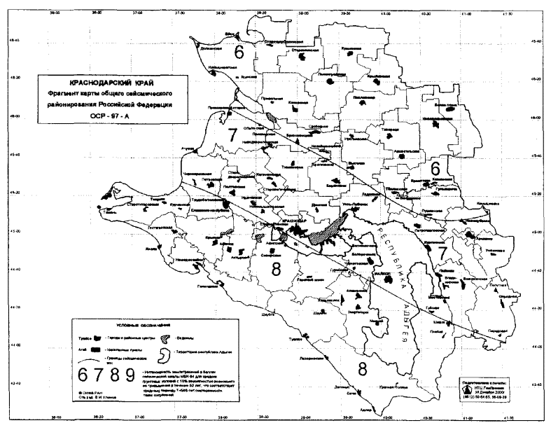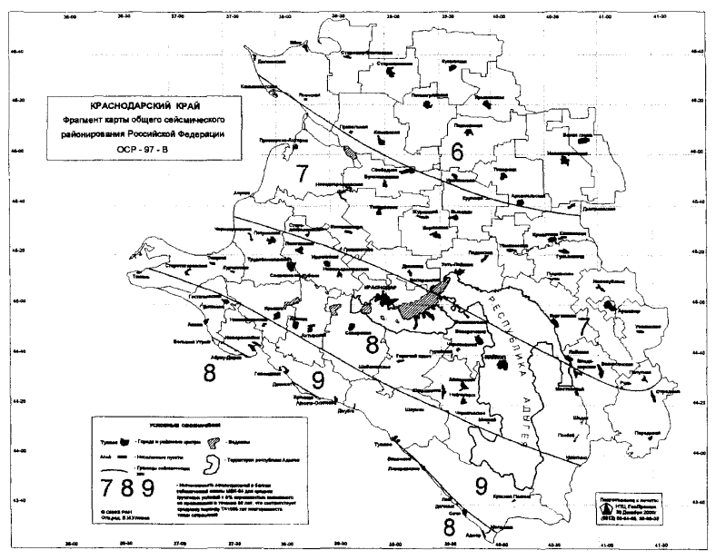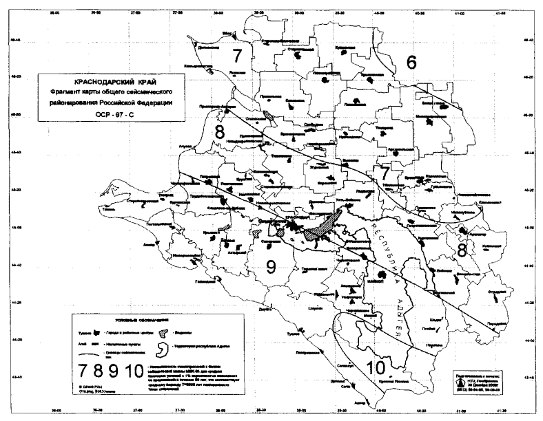 Приложение Б(обязательное) СПИСОК НАСЕЛЕННЫХ ПУНКТОВ Краснодарского края, расположенных в сейсмических районах, с указанием расчетной сейсмической интенсивности в баллах шкалы МSК-64 для средних грунтовых условий и трех степеней сейсмической опасности - А(10%), В(5%), С(1%) в течение 50 лет