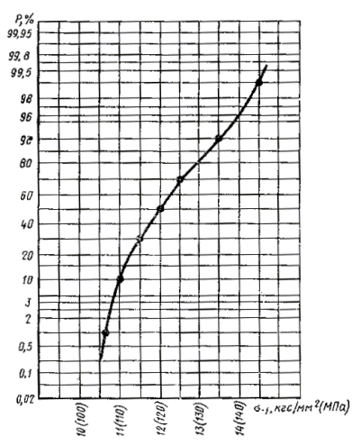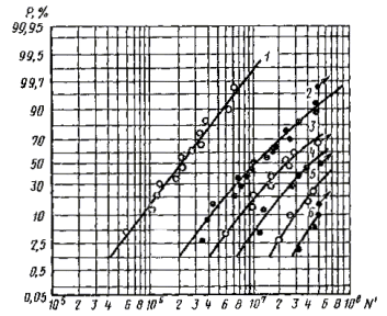 Кривые распределения долговечности (Р-N) строят на вероятностной бумаге, соответствующей логарифмически нормальному или другому закону распределения. По оси абсцисс откладывают значения долговечности образцов N, а по оси ординат - значения вероятности разрушения образцов (накопленные частоты), вычисляемые по формуле