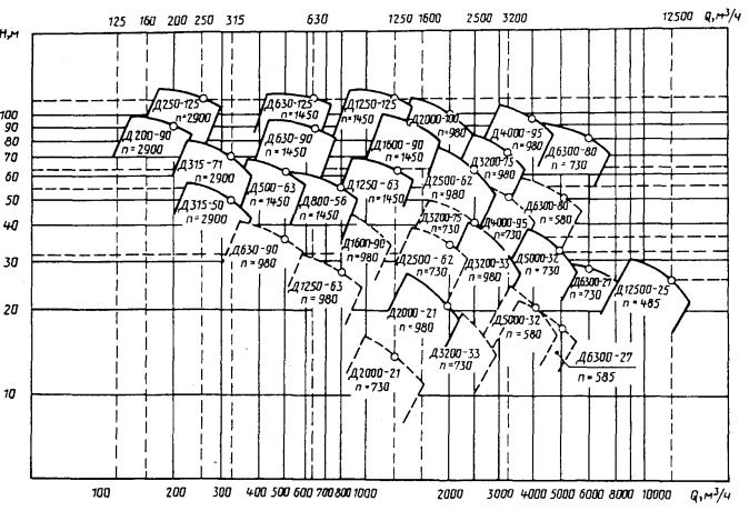 Примечание. Пунктиром отмечены области работы насосов при пониженной частоте вращения.