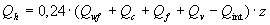 где: Qh - количество тепловой энергии, необходимой для поддержания комфортной температуры в помещении, кВт·ч; Qwf - тепловой поток через фасад здания (стены и окна), Вт; Qc - тепловой поток через чердачное перекрытие, Вт; Qf - тепловой поток через перекрытие над подвалом, Вт; Qv - теплопотери за счет вентиляции, Вт; Qint - бытовые тепловыделения, Вт; z - продолжительность работы системы отопления, сут. Ж.2.3. Тепловой поток через ограждения фасада здания (Qwf), Вт, обусловленный наружными условиями - температурой наружного воздуха, скоростью ветра и количеством поступающей солнечной радиации, определяется по формуле: где: Tint - расчетная температура внутреннего воздуха, °С, принимаемая по табл. 3.2; Tef - расчетная эффективная температура, °С, определяемая по приложению И; Rwf - приведенное сопротивление теплопередаче ограждений фасада здания в целом, м2·°С/Вт; Awf - площадь ограждений фасада здания, м2. Ж.2.4. Тепловой поток через чердачное перекрытие (Qc), Вт, определяются по формуле: