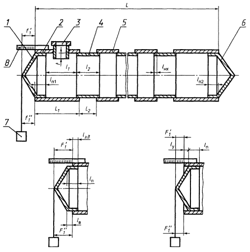 Д.4.4 Результаты вычислений по формулам (Д.13) или (Д14), (Д.15), (Д.16) или (Д.17) вносят в журнал, форма которого приведена в приложении Е. Д.5 Вычисление длины цилиндрической части резервуара Д.5.1 Длину цилиндрической части резервуара LА или LБ вычисляют по формулам: а) при наличии выступов днищ (кроме плоских днищ) б) при наличии углубления днищ (кроме плоских днищ) Д.5.2 Длину цилиндрической части резервуара с плоскими днищами LВ или LГ вычисляют по формулам: а) при наличии выступа днищ б) при наличии углубления днищ где dд - толщина стенок днищ. Д.5.3 Результаты вычислений по формулам (Д.18) или (Д.19), (Д.20) или (Д.21) вносят в журнал, форма которого приведена в приложении Е. Д.6 Вычисление внутреннего диаметра цилиндрической части резервуара Д.6.1 Внутренний диаметр цилиндрической части резервуара (далее - диаметр резервуара) D вычисляют по формуле Д.6.2 Результат вычисления D вносят в журнал, форма которого приведена в приложении Е. Д.7 Вычисление внутренних выпуклостей (высот) днищ Д.7.1 Внутреннюю выпуклость (высоту) переднего f1 или заднего f2 днища (рисунок А.2) вычисляют по формулам: а) при отсутствии выступов и углублений