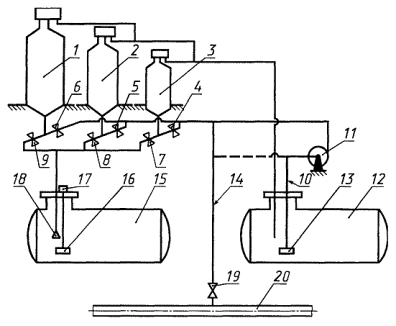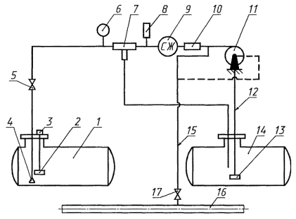 где 9.2.3.2 Поверочную жидкость (далее - жидкость) подают (рисунок А.6) в мерники 1, 2, 3 из приемного резервуара 12 с помощью насоса 11 или технологического трубопровода (водопровода) 20, открывая вентиль 19 и регулируя вентилями 4, 5, 6 режим потока жидкости. При этом вместимость мерника или суммарная вместимость мерников должна соответствовать объему дозы жидкости, вычисленному по формуле (8). 9.2.3.4 В порядке, указанном в 9.2.3.2 и 9.2.3.3, подают следующие дозы жидкости (DVм)j в резервуар с одновременным измерением уровня жидкости Нj и ее температуры (Tp)j в пробах, отобранных из резервуара по ГОСТ 2517 после налива в него каждой дозы. При этом первую пробу отбирают при достижении уровня жидкости в резервуаре 500 мм. 9.2.3.7 Допускается отбор проб жидкости из резервуара и измерения температуры проводить через каждое изменение уровня жидкости в резервуаре на 500 мм, как указано в 9.2.3.4. В этом случае температуру жидкости в резервуаре после поступления в него каждой дозы вычисляют по результатам измерений температур в начале и конце поступления суммарной дозы, объем которой соответствует изменению уровня жидкости в резервуаре на 500 мм. 9.2.3.8 При подходе уровня жидкости к расширителю струи 18 (см. рисунок А.6) его поднимают ближе к горловине резервуара и прикрепляют магнитными наконечниками к внутренней стенке горловины. 9.2.3.9 Резервуар наполняют дозами жидкости до предельного уровня Hпр, мм, вычисляемого по формуле где D - внутренний диаметр резервуара; t - глубина заложения горловины. Значение t определяют по результатам измерений глубины заложения горловины в соответствии с 9.1.12. 9.2.3.10 Измеряют измерительной рулеткой с грузом: - максимальный уровень жидкости в резервуаре Hp max; - базовую высоту резервуара Hб. Максимальный уровень и базовую высоту измеряют два раза. Расхождения между результатами двух измерений максимального уровня и базовой высоты не должны превышать 2 мм. За действительные значения максимального уровня и базовой высоты принимают средние арифметические значения их измерений. 9.2.3.11 Значение базовой высоты, определенное по 9.2.3.10, не должно отличаться от значения, установленного 9.2.1, более чем на 0,1 %. 9.2.3.12 Результаты измерений объема (DVм)j и температуры (Tм)j жидкости в мерниках, уровня (Hp)j температуры (Tp)j и плотности жидкости r0 в резервуаре, глубины заложения горловины t, базовой высоты Нб максимального уровня Нp max вносят в протокол, форма которого приведена в приложении Г. 9.2.4 Поверка резервуара с применением уровнемера и счетчика жидкости 9.2.4.1 Поверку резервуара проводят по схеме, приведенной на рисунке А.7, в следующей последовательности: а) открывают вентиль 5; б) устанавливают указатели шкал приборов (при необходимости) на нулевую отметку; в) снимают показание счетчика жидкости 9 q0 (N0); г) переводят трехходовой кран 7 в положение «Измерение»; д) поверочную жидкость подают в резервуар 1 через счетчик жидкости 9 из приемного резервуара 14 или технологического трубопровода (водопровода) 16, открывая вентиль 17, и наполняют резервуар дозой жидкости до появления на дисплее уровнемера 3 значения 10 мм; е) снимают показание манометра 6 р0; ж) снимают показание термометра (измерителя температуры) 8 (Tт)0; з) выключают насос 11 или закрывают вентиль 17 и снимают показание счетчика жидкости 9 q1 (N1). 9.2.4.2 Включают насос 11 или открывают вентиль 17 и в пределах 1/20, части номинальной в