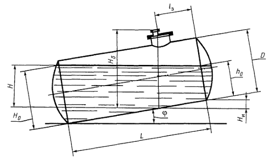 где H - уровень жидкости в резервуаре; L - длина цилиндрической части резервуара, вычисляемая по формулам (Д.18) или (Д.19), (Д.20) или (Д.21); Dk - диаметр пояса, на котором смонтированы горловина или измерительный люк резервуара;