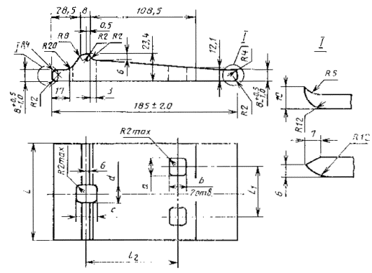Примечание. При отсутствии в заказе потребителя исполнения подкладки Р33 исполнение определяет изготовитель. 1.2. Радиусы закруглений, не указанные на чертеже, должны быть не более 3 мм. 1.3. Размеры, на которые не установлены предельные отклонения, приведены для построения калибров и в готовых подкладках не контролируются. 1.4. Площадь поперечного сечения профиля и масса подкладок приведены в приложении. Пример условного обозначения подкладки РЗЗ исполнения 1: Подкладка 1 РЗЗ ГОСТ 8142-89 1. ТЕХНИЧЕСКИЕ ТРЕБОВАНИЯ2.1. Подкладки изготовляют в соответствии с требованиями настоящего стандарта по технологической документации, утвержденной в установленном порядке. 2.2. Подкладки изготовляют из полос, прокатанных из стали марок Ст3кп, Ст3пс, Ст3сп, Ст4кп, Ст4пс, Ст4сп по ГОСТ 380, категории 1, 3, 4 и уровнем механических свойств по ГОСТ 535 (кроме испытании на изгиб). Категорию указывают в заказе потребителя. Если категория не указана в заказе потребителя, ее устанавливает изготовитель. 2.2.1. Подкладки могут изготовляться из стали с массовой долей меди до 0,6 %. 2.3. На поверхности прилегания подкладок к рельсам не допускаются раскатанные загрязнения и пузыри, трещины, а также отпечатки прокатного производства. На остальных поверхностях допускаются раскатанные пузыри, прокатные плены, рванины, закаты глубиной не более 1 мм, скол при штамповке не более 2 мм. 2.4. В верхней части отверстий, в местах прилегания рельса к подкладке, не допускаются выпуклости и заусенцы. На торцах подкладок со стороны прилегания их к шпале и по периметру отверстий высота заусенцев не должна быть более 1 мм. На торцах подкладок не допускаются расслоения и следы усадочной раковины. 2.5. Дефекты должны быть удалены обдиркой, зачисткой, вырубкой, не выводящие размеры профиля за пределы минусового отклонения. Заварка дефектов не допускается. Утяжка металла при рубке не контролируется. 2.6. Вогнутость поверхности прилегания подкладок к подошве рельса не допускается. Равномерная поперечная выпуклость поверхности прилегания подкладок к подошве рельса не должна быть более 0,5 мм. Вогнутость или выпуклость поверхности прилегания к шпале не должна быть более 1,0 мм. 2.7. Косина реза торцов подкладки не должна превышать в вертикальной плоскости 3,0 мм, в горизонтальной - 5,0 мм. 2.8. Подкладки должны выдерживать без излома, трещин и надрывов испытания на изгиб на угол не менее 45° (внутренний угол 135°). 3. ПРИЕМКА3.1. Для контроля соответствия качества подкладок требованиям настоящего стандарта проводят приемо-сдаточные испытания. 3.2. Подкладки предъявляют к приемке партиями в количестве от 1000 до 10000 шт. Партия должна состоять из подкладок одного тина и одной марки стали. Если остаток от деления на партии менее 1000 шт., то его присоединяют к одной из партии. 3.3. Для проверки соответствия подкладок требованиям настоящего стандарта отбирают: 1 пробу от плавки-ковша для определения химического состава стали; 1 % подкладок от партии для контроля качества поверхности и размеров подкладок (кроме межцентровых расстояний между отверстиями); 1 подкладку от партии для испытания на изгиб; 1 пробу от полосы одной плавки для испытания на растяжение; 2 пробы от полосы одной плавки для испытания на ударную вязкость. 3.4. При обнаружении подкладок, не соответствующих размерам, установленным в п. 1.1, или при наличии наружных деф