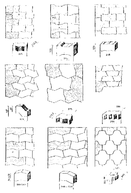 Рис. 4.3. Схемы раскладки фигурных бетонных мелкоразмерных элементов мощения (размеры даны в мм)