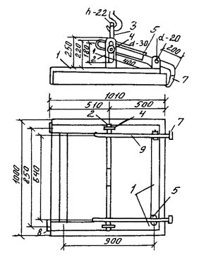 Рис. 3.1. Захват для укладки плит: 1 - рама из труб прямоугольного сечения (40×60 мм); 2-вал траверсы; 3 - несущая траверса; 4 - полоса с вырезом; 5 - скоба; 6 - палец; 7 - полоса размером 100×80×10 мм; 8 - полоса размером 150×100×10 мм; 9 - рычаг