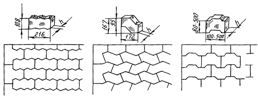 Рис. 3.6. Схемы раскладки фигурных элементов мощения 3.11. При укладке плит на бетонное основание в зимнее время поверхность его должна быть тщательно очищена от грязи, снега и льда и затем прогрета. Для облегчения удаления ледяного покрова рекомендуется оттаивание его разливом раствора CaCl2 в количестве 1 л/м2. Очистку и прогрев бетонного основания можно производить асфальторазогревателем или при помощи установки, применяемой для устройства кровель с наплавляемым рубероидом, а также нагретым до температуры 180 - 200 °С горячим песком, который укладывают толщиной слоя 5 - 7 см, с последующим его удалением. 3.12. По очищенному и подогретому бетонному основанию укладывают подогретый цементно-песчаный раствор толщиной до 20 мм, температура которого не должна превышать 35 °С. 3.13. Работы по устройству тротуаров во время сильного снегопада прекращаются. Подготовленные участки выравнивающего слоя укрываются передвижными навесами, брезентом или соломенными матами. Производить укладку плит при температуре ниже - 15 °С не рекомендуется. 3.14. Заделку швов рекомендуется производить только весной. В случае необходимости заполнения швов зимой следует предварительно подогреть места сопряжении плит и заполнить их подогретой до 35 °С песчано-цементной смесью. 4. ПРИЕМКА РАБОТ4.1. Тротуары должны быть выполнены в соответствии с проектом, СНиПом и другими действующими нормативно-техническими документами. 4.2. При приемке тротуаров должны быть проверены: а) соответствие утвержденному проекту конструкций основания подстилающего слоя, дренажных устройств и водоотвода. Проверка ведется по актам на «скрытые» работы, журналам производства работ и лабораторным данным; б) соответствие ширины тротуара проектному размеру; в) продольный и поперечный профили покрытия и их соответствие проекту (проверяется контрольным нивелированием); г) ровность поверхности покрытия, которая выполняется путем контрольных замеров 3-метровой рейкой не менее чем через 20 м; просветы под рейкой не должны превышать 3 мм. 5. ТРЕБОВАНИЯ БЕЗОПАСНОСТИ5.1. Техника безопасности на строительных объектах должна соблюдаться в соответствии с требованиями СНиП III-4-80* «Техника безопасности в строительстве». Ответственность за состояние техники безопасности и промышленной санитарии возлагается на начальника и главных инженеров специализированных управлений и трестов. 5.2. Санитарно-бытовые помещения на объектах должны быть оборудованы в соответствии с гигиеническими требованиями Министерства здравоохранения России. 5.3. К работам допускаются лица не моложе 18 лет, прошедшие медицинский осмотр, обученные по утвержденной программе безопасным методам работы и проинструктированные непосредственно на рабочем месте. Проверка знаний производится ежегодно комиссией, после чего рабочим выдаются удостоверения. 5.4. За соблюдение правил техники безопасности при строительстве несет ответственность главный инженер строительного управления и производитель работ. 5.5. Проверка знаний по технике безопасности инженерно-технических работников должна производиться ежегодно. При неудовлетворительных знаниях управляющий трестом обязан не допускать инженерно-технический персонал к руководству работами. 5.6. Рабочие должны быть обеспечены специальной одеждой и исправным ручным инструментом в соответст