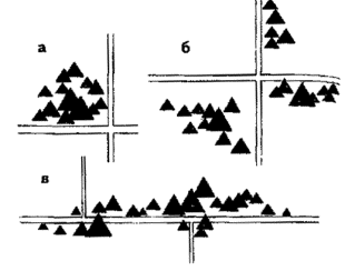 а Компактная б Расчлененная в Линейная Рис. 3 Схемы размещения «кустовых» образований МП на городских магистралях