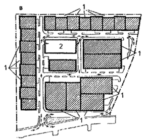 а «Кустовое» образование в исторически сложившейся городской застройке б «Кустовое» образование в новом городском районе 1 модули МП 2 универсальный магазин 3 здание для офисов 4 «торговая улица» 5 автостоянка 6 хоздвор 7 подземный грузовой проезд Рис. 5 Примеры планировки «кустовых»