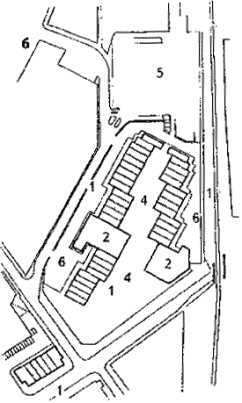 обслуживанию населения и жилыми помещениями на верхнем уровне (Англия) 1 модуль для МП торгово-бытового назначения 2 модуль для офисов 3 складской модуль 4 гаражный бокс 5 хоздвор 6 жилое помещение 7 загрузочная площадка 8 зона транспортировки грузов 9 вход в офисы 10 рампа