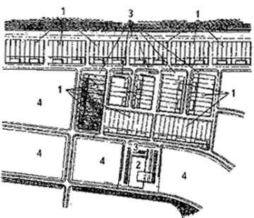 1 модули МП 2 здание для офисов и учреждений обслуживания 3 автостоянка 4 территория промышленного района Рис. 6 Пример планировки «кустового» образования МП производственного