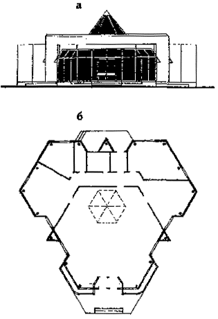 Рис. 14 Здание для офисов на 1000 работающих. а Фасад; б План типового этажа