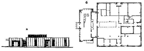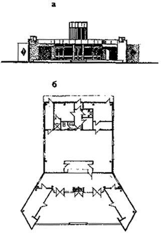 Рис. 9 Пекарня мощностью 2,4 т/12 час с торговым залом площадью 120 кв.м. Типовой проект ХIV-2 МНИИТЭП а - фасад; б - план