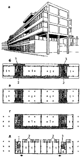 Рис. 15 Многомодульное здание для малых промышленных предприятий (Англия) а - общий вид; б - план 5 этажа; в - план 3 и 4 этажей; г - план 2 этажа; д - план 1 этажа 1 - модуль для МП 2 – санузел 3 - вспомогательное помещение 4 - электрощитовая
