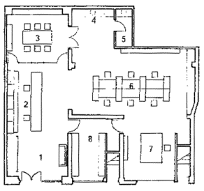 4.2.3. Рекомендуется размещать в общем помещении функциональные процессы следующих видов: а) однотипные основные процессы; б) разнотипные основные процессы одной и той же санитарной группы и взрыво-пожароопасной категории; в) основные непроизводственные процессы и хранение уличной одежды в закрытых шкафах; г) основные производственные процессы (относящиеся по санитарной характеристике к группам 1а, 1б, за исключением пожаро- и взрывоопасных производств категорий А и Б) и хранение уличной и рабочей одежды в закрытых шкафах установленного типа при численности работающих до 20 человек; д) холлы, обеспеченные пожарными эвакуационными выходами, и: - хранение уличной и рабочей одежды в закрытых шкафах при общем числе мест хранения до 20 для МП без производства и с производствами, относящимися по санитарной характеристике к группам 1а, 1б; - буфеты самообслуживания - до 20 мест; - рабочее место секретаря (до двух мест). В зоне видимости секретаря целесообразно предусматривать хранение уличной одежды персонала и посетителей в открытых альковах на вешалах; е) целевые непроизводственные процессы (за исключением связанных с непосредственным обслуживанием или приемом посетителей) и буфеты самообслуживания (до 10 мест), которые следует отделять от рабочих мест экранами или группами декоративных цветов); ж) «чистое» и «грязное» гардеробное обслуживание (до 15 человек в максимальную смену на производствах, относящихся по санитарной характеристике к группам II и IIIа) с взаимно противоположным расположением закрытых шкафов с «чистой» и «грязной» одеждой; 4.2.4. Места для кратковременного отдыха (кресла, секции диванов) предусматриваются в буфетах самообслуживания, холлах (вестибюлях), также в специально выделенных зонах при рабочих местах из расчета одно место на 10 работающих в максимальную смену. 4.2.5. Уборные рекомендуется предусматривать, как правило, со шлюзами, используемыми для установки умывальников и для курения. 4.2.5. В МП с производственными процессами 1а, 1б, II рекомендуется объединять уборные, умывальные, закрытые душевые кабины (до 4-х) в общие блоки. 4.2.6. Могут быть использованы другие возможности планировочного интегрирования функциональных процессов, в т.ч. с не совпадающими санитарными и гигиеническими параметрами внутренней среды, по согласованию с Центром Госсанэпиднадзора в г. Москве и УГПС ГУВД г. Москвы, учитывая возможность применения технических и планировочных мероприятий по снижению уровня возможных отрицательных воздействий. Например, в небольших прачечных процессы стирки, отжима, сушки, глажения и мелкого ремонта белья располагаются обычно в общем помещении, не вызывая неудобств, хотя эти процессы и относятся к различным санитарным группам. 4.2.7. Функциональные процессы, являющиеся источниками шума, вибрации, выброса в атмосферу вредных и пахнущих веществ, с большими выделениями тепла, пыли, влаги, пожаро- и взрывоопасные и др., должны быть отделены от остальных функциональных процессов. 4.2.8. Для создания компактной планировки следует рационально использовать не только площадь пола, но и весь объем помещений, применять приемы хранения материалов, изделий, документации и т.п. на всю высоту помещения: по ярусам, на антресолях, в штабелях. 4.3. Гибкость планировки4.3.1. Важнейшим качеством планировки МП является ее гибкость (тр