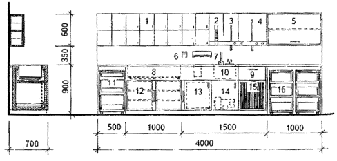1 - индивидуальные шкафчики; 2 - стаканы; 3 - горячая вода; 4 -кофе; 5 - чистая посуда; 6 - приспособление для раскупоривания бутылок; 7 - бумага; 8 - холодильник; 9 - приборы; 10 - раковины; 11 - пустая посуда; 12- охлаждаемое отделение; 13 - отбросы; 14 -холодильный агрегат; 15 - салфетки; 16 - использованная посуда