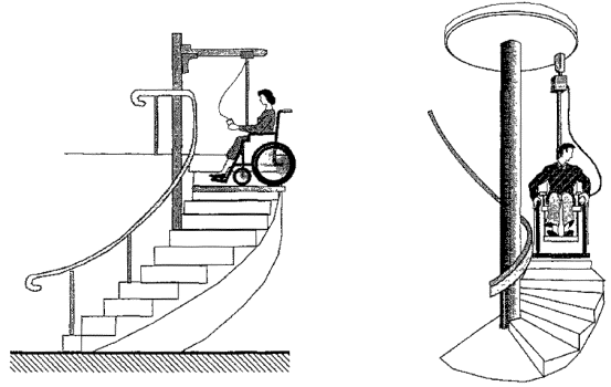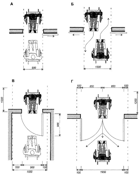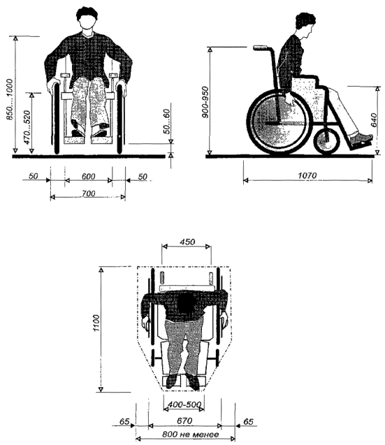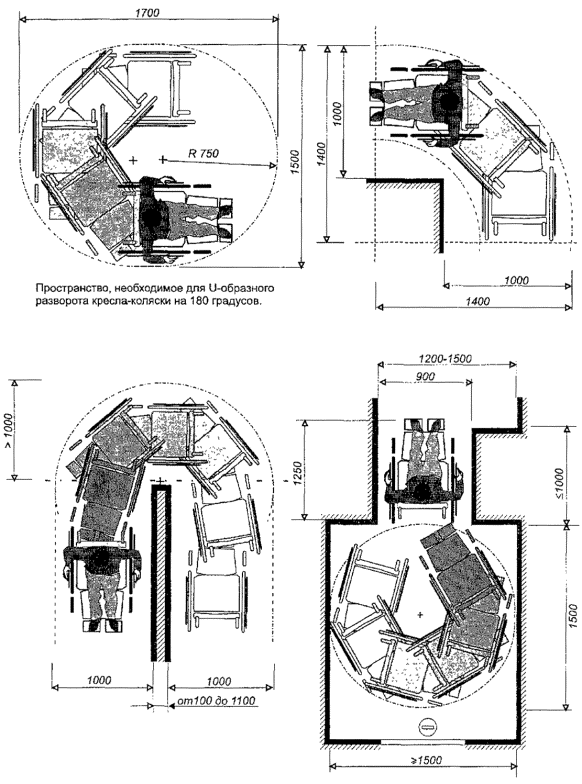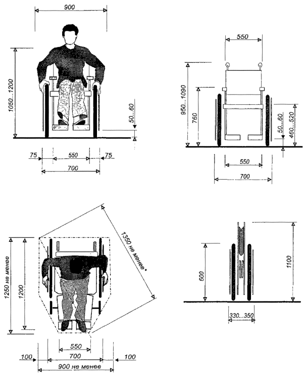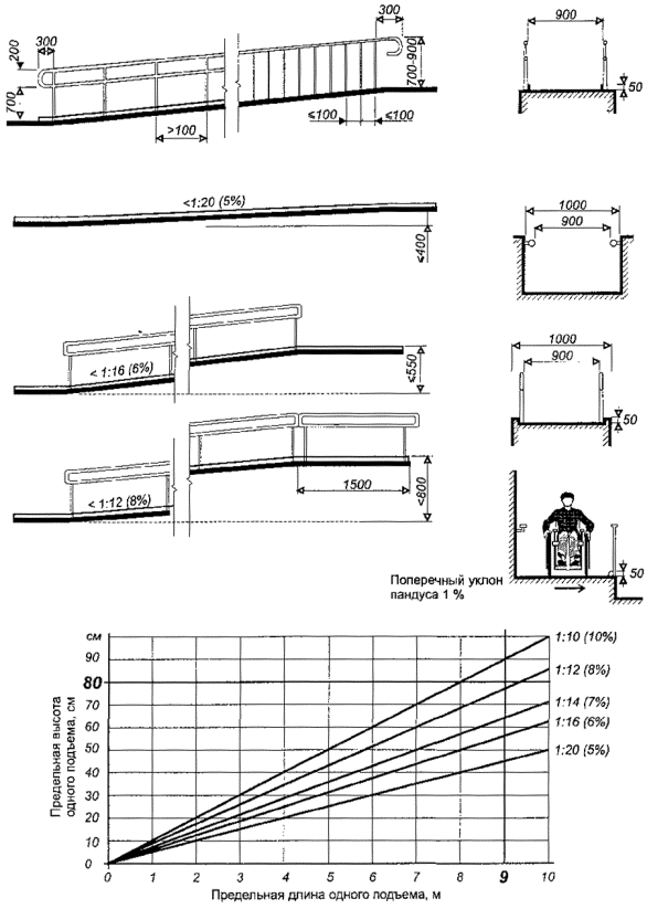 Рисунок 1 - Зависимость величины уклона винтового пандуса от его внутреннего радиуса 4.9 Допускается объединение коммуникационных путей с зонами обслуживания и отдыха в общих пространствах, в том числе пассажах, атриумах. В этих случаях рекомендуется места обслуживания МГН размещать не выше второго уровня (этажа). 4.10 Коммуникационные пути рекомендуется совмещать с эвакуационными путями. Необходимость создания дополнительных путей и устройств, облегчающих и ускоряющих эвакуацию, особенно для лиц с нарушением здоровья, определяется расчетом. Расчет путей эвакуации следует производить с учетом площади, занимаемой инвалидами и другими маломобильными посетителями, по таблице 4.2. Таблица 4.2 - Максимальные размеры площади, занимаемой инвалидами в плане
