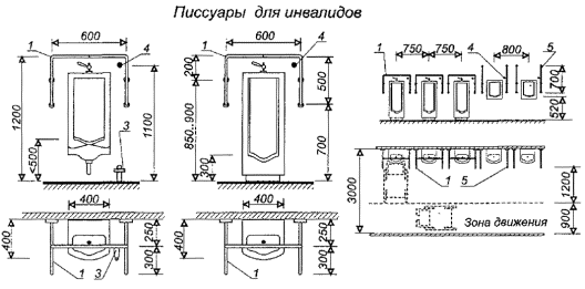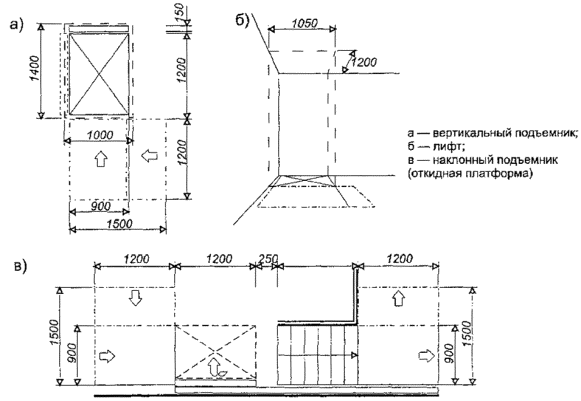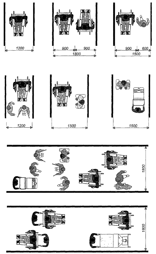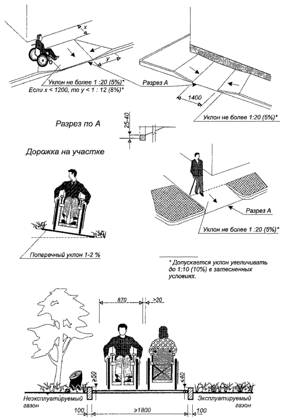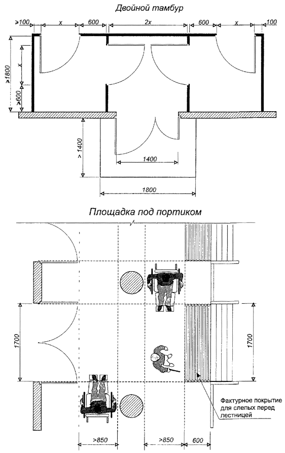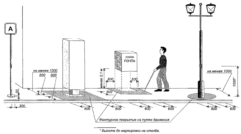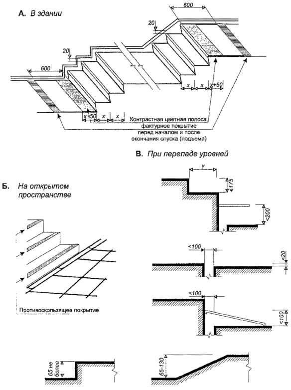 3.6 При организации на участке подъезда транспортных средств непосредственно к входу на входных площадках и в портиках рекомендуется предусматривать: а) в учреждениях с формой обслуживания по варианту «А»: · возможность одновременных прохода пешеходов и посадки или высадки пассажиров; · места на горизонтальной части входной площадки или портика, достаточные для остановки транспортного средства, пропускающего пешеходные потоки; · разметку пешеходных и транспортных путей на пандусах и площадке; б) в учреждениях с формой организации обслуживания по варианту «Б» (дополнительно к указанным для варианта «А»): · создание оборудованного подхода для инвалидов, не пересекающегося с транспортными путями; · при наличии нескольких лестниц (или лестниц, охватывающих площадку с нескольких сторон) как минимум одна оборудуется для МГН. 3.7 В портиках и на крытых площадках высота проходов от поверхности пешеходного пути до низа конструкции или низа любых подвесных элементов в свету должна быть не менее 2,5 м, а проездов - 4,5 м. При этом транспортные пандусы и проезды должны иметь сквозной проезд или разворотные площадки для эвакуации транспортных средств. 3.8 На участках перед входами в общественные здания районного или муниципального значения рекомендуется создавать озелененные и благоустроенные площадки для отдыха, оборудованные навесами, скамьями, телефонами-автоматами, указателями, светильниками, сигнализацией и т.п. На земельных участках предприятий питания и торговли целесообразно организовать зону общего пользования с местами кратковременного отдыха МГН, оборудуя эти зоны информационными и рекламными устройствами. Интерьерный характер таких зон может быть усилен разнообразными видами мощения, системой освещения, указателями, элементами озеленения: вазонами, цветочными выгородками, являющимися одновременно ориентирами для людей с недостатками зрения. 3.9 В зоне стоянок личного автотранспорта посетителей общественных зданий следует выделять места для парковки автотранспортных средств инвалидов, которые не должны загораживаться другими паркуемыми автомашинами. При наличии на стоянке мест для парковки автомашин, салоны которых приспособлены для перевозки инвалидов на креслах-колясках, ширина боковых подходов к местам стоянки таких машин должна быть не менее 2,5 м. Высота свободного пространства до низа конструкций, перекрывающих место стоянки и посадочных зон, должна быть не менее 2,9 м. 3.10 К информационным средствам на участках, используемых МГН, следует относить: · рельефные, фактурные и иные виды тактильных поверхностей путей движения на участках, дорогах и пешеходных трассах; · ограждение опасных зон; · разметку путей движения на участках, знаки дорожного движения и указатели; · информационные сооружения (стенды, щиты и объемные рекламные устройства); · светофоры и световые указатели; устройства звукового дублирования сигналов движения. 3.11 В пределах участков зданий и сооружений рекомендуется обеспечивать непрерывность информации на путях движения к местам обслуживания и отдыха. При проектировании на приобъектных участках информационных узлов рекомендуется в зоне ожидания таких узлов визуальную информацию дублировать тактильной. 3.12 Тактильные указатели следует устанавливать на следующих элементах путей д