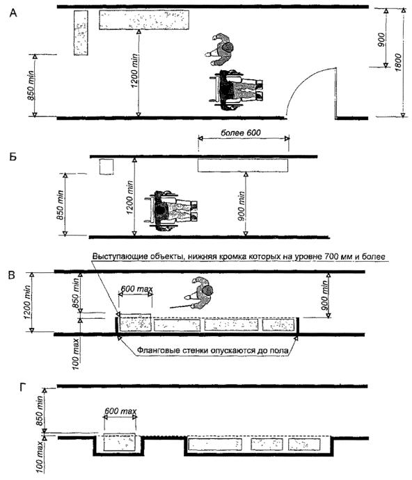 4.11 На путях движения пользователей по зданию следует стремиться к уменьшению количества выступающих углов, пилястр, избегать острых кромок оборудования. Рекомендуется скруглять внешние углы выступающих в сторону путей движения частей оборудования в местах ожидания и отдыха (радиус - не менее 5 см). 4.12 Поэтажные лифтовые холлы для облегчения ориентации посетителей должны иметь на каждом этаже различные декоративные, пространственные или цветовые решения интерьеров. 4.13 В коммуникационных помещениях и пространствах для предупреждения о пересечениях путей рекомендуется использовать формы архитектурной пластики порталов, активную пластику декора пути. 4.14 На путях движения маломобильных посетителей в здании следует предусматривать смежные с ними зоны отдыха и ожидания не реже чем через 25 м пути, в том числе хотя бы одну на каждый этаж, доступный для МГН. Места отдыха (ожидания) рекомендуется размещать в тихом месте вдали от витрин, стендов, элементов помещений, где возможно возникновение сквозняков, перегрева, яркого освещения. В местах отдыха или ожидания следует предусматривать возможность размещения не менее одного места для инвалида на кресле-коляске или пользующегося костылями и тростью, а также его сопровождающего. При размещении мест отдыха или ожидания в нишах рекомендуется обеспечивать их подсветку, выявлять цветом и фактурой материала места сидения маломобильных посетителей. При этом важно, чтобы поверхность мест сидения контрастировала с покрытием пола. Рекомендуется наличие и разметка на покрытии пола границ резервной зоны (места возможного размещения) кресла-коляски. 4.15 Рекомендуется, если это не противоречит концепции проекта и если по специфике требований для жилого, общественного или производственного здания не требуется иная окраска, выделять: красным цветом - зоны риска или зоны, куда вход запрещен, в частности, служебные входы, места проведения ремонтных работ, места с перепадами уровня пола; желтым цветом - зону поворота и место, занимаемое открытой дверью, ограничительные бортики, пересечение пути, первую и последнюю ступени лестницы. Применение этих приемов не должно разрушать общее художественное решение интерьеров и фасадов. 4.16 Декоративные изделия и скульптура в интерьере не должны выступать в полосу движения на высоту 2,1 м и не должны в пределах этой высоты иметь детали, способные зацепить или поранить при столкновении с ними. При размещении растений в интерьерах следует избегать попадания их частей в зоны движения и места отдыха (ожидания) в пределах их габаритов. Места установки емкостей с растениями рекомендуется ограждать бортиками высотой не менее 0,1 м. 4.17 Декор полов и площадок, независимо оттого, какой материал применен, рекомендуется сочетать с рисунком, совмещающим в себе разметку путей движения, зон ожидания и декоративные свойства. 4.18 Ковровые покрытия пола должны быть прочно закреплены, особенно по краям. Применяемые в качестве покрытий пола ковры должны иметь ровные или текстурные петли либо ровно подрезанный ворс высотой не более 0,013 м. Высота коврового покрытия вместе с ворсом на границе с поверхностью не закрываемого ковром пола не должна превышать 0,013 м. 4.19 Ребра решеток, находящихся на путях движения МГН, должны располагаться на расстоянии друг от друга не более 0,013 