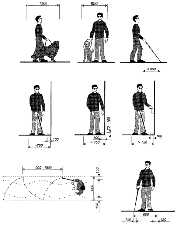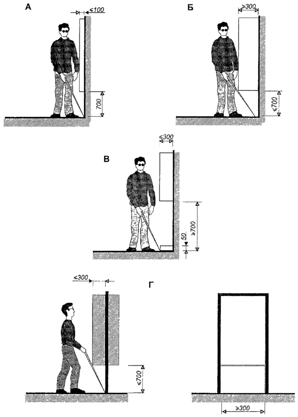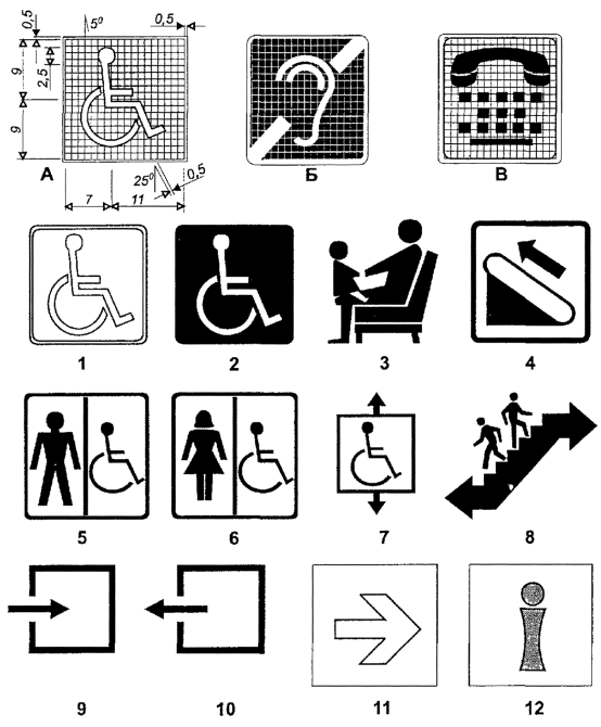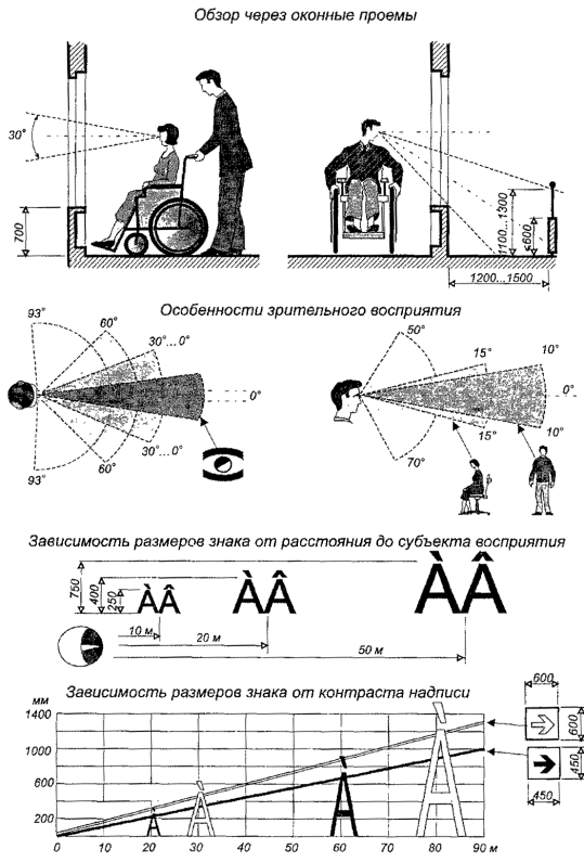 Информационные устройства могут быть визуальными, акустическими (звуковыми) и тактильными. Наименование групп, подгрупп и видов информационных сигнальных устройств и средств связи, доступных для инвалидов, приведены в таблице 7.1 (ГОСТ Р 51671). ВИЗУАЛЬНЫЕ УСТРОЙСТВА И СРЕДСТВА ИНФОРМАЦИИ7.3 К визуальным устройствам и средствам информации, используемым для вспомогательного управления движением и поведением посетителей, относятся: · указатели и знаки, в том числе цветовые; · разметка и цвет элементов оборудования; · щиты, стенды, табло; · тактильные табло; · световые маяки. См. часть 3, рисунки 3.16-3.18. 7.4 Для создания визуальной информации рекомендуется использовать общеупотребительные символы и пиктограммы. Шрифт и начертание символов рекомендуется принимать по ГОСТ 10807, а также принимать по нему и указатели. 7.5 На путях движения рекомендуется применять направляющие символы и ограничительную (латеральную) разметку: а) по ходу внутрь здания или сооружения: справа: на белом или светлом фоне - темные символы, разметка на темном фоне - белая (светлая), на светлом - черная или темная; слева: на темном фоне - белые символы, разметка - темная. Контрастность тонов - не менее 1:8; б) по оси движения: белая или черная (контрастная к фону пунктирная полоса) - прерывистая разметка. Рекомендуемая высота разметки на стенах на уровне глаз пользователя - от 1,2 до 1,6 м. 7.6 Разметку на стенах рекомендуется выполнять шириной не менее 150 мм и иметь на путях, ведущих к выходу, слева - светлый фон с темными буквами и символами, а справа - темный фон со светлыми буквами и символами. Контраст разметки тонов и фона должен быть не менее 1:4. Высота размещения полос разметки - от 0,9 до 1,6 м. 7.7 Желательно графически выделять на полу и на стенах зоны риска (например, открывания полотна двери). 7.8 Применяемые текстовые табло с переменным содержанием (матричные, бегущая строка и т.п.) должны иметь символы по ГОСТ 10807. Экраны телемониторов и проекторов следует располагать в затененных местах для обеспечения необходимой контрастности изображения. Не следует размещать экраны со стороны оконных проемов. 7.9 Знаки и символы должны быть контрастными по отношению к фону: светлые знаки - на темном фоне или темные знаки - на светлом. Они должны иметь размеры, соответствующие расчетному расстоянию распознавания: на расстояниях до 20 м - высота и ширина знака должны быть не менее 0,3 м, на расстоянии 100 м - не менее 1,5 м. Размеры знаков, которые могут восприниматься с расстояний, имеющих промежуточные значения, следует определять по интерполяции. 7.10 Буквы и цифры, изображаемые на знаках, должны иметь пропорции в пределах отношения ширины к высоте от 3:5 до 1:1, а отношение ширины штрихов к их высоте от 1:5 до 1:10. Высота прописных букв надписей на указателях, размещенных под потолком помещения на высоте более 2 м, измеренной от пола до нижней кромки указателя, должна быть не менее 0,075 м. 7.11 Освещенность поверхности надписей, знаков, символов и пиктограмм должна быть одинаковой на всей поверхности средств отображения информации. Ее значение должно составлять от 100 до 300 лк. Цветографическое решение визуальных средств отображения информации должно соответствовать общему интерьеру зданий, сооружений и обеспечивать четкость и выразительность подачи информации. 7.12 Следует применять приборы и устройства яркост