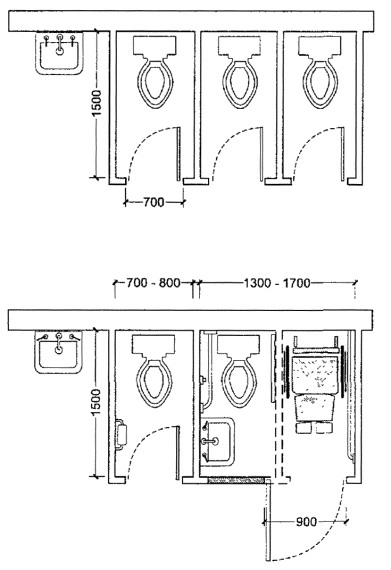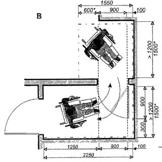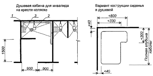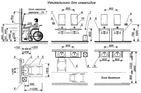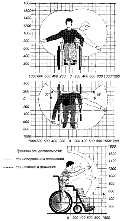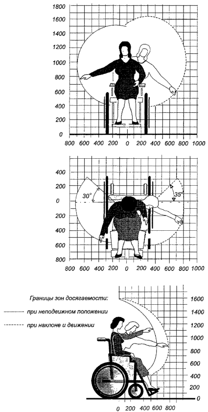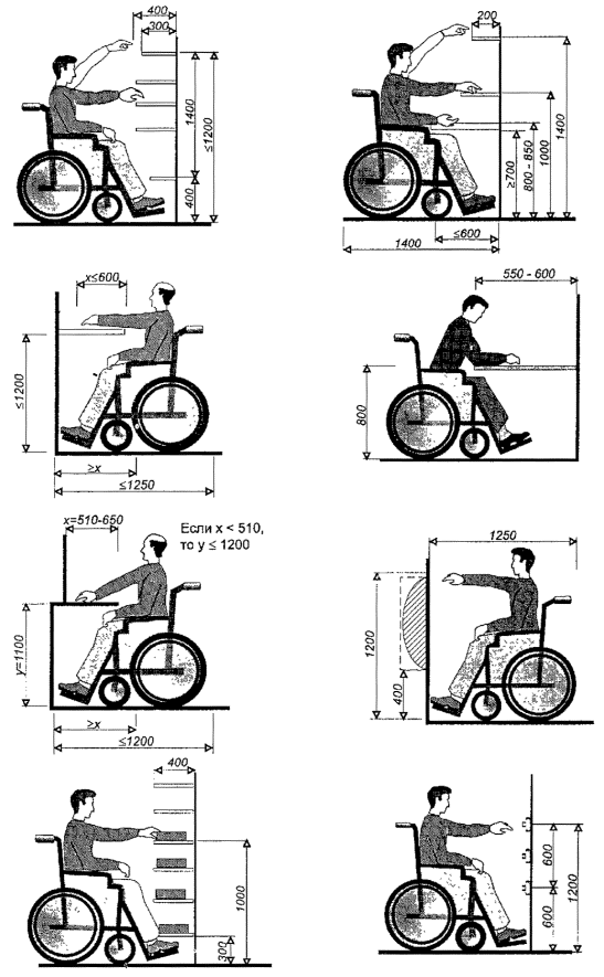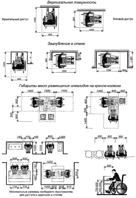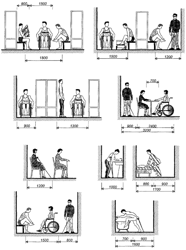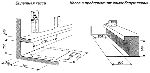 Коммуникационные зоны помещений обслуживания должны соответствовать требованиям раздела 4 данного Свода правил. 5.6 В помещениях при совмещении функционального обслуживания с перемещением (например, в музеях, спортзалах, супермаркетах и т.д.) рекомендуется выделять зоны безопасности, буферные и информационные полосы у стен и по периметру стационарного напольного оборудования или экспонатов. 5.7 В полифункциональных помещениях, объединяющих несколько функций, рекомендуется для маломобильных граждан проектировать пути целевого движения и подходы к каждой зоне обслуживания с минимальным количеством пересечений различных потоков в одном уровне. 5.8 В универсальных помещениях с трансформируемым оборудованием доступность зон и мест обслуживания рекомендуется обеспечивать при всех вариантах трансформации. Рекомендуется обеспечивать средствами информационной поддержки каждый вариант трансформации помещений в соответствии с требованиями раздела 7 данного Свода правил. 5.9 В помещениях с местами обслуживания, имеющими стационарное специализированное оборудование (в том числе медицинские кушетки, парикмахерские и стоматологические кресла и т.п.), рекомендуется предусматривать резервную площадь для временного хранения индивидуальных реабилитационных средств в целом на помещение или непосредственно при месте обслуживания. 5.10 Рекомендуется предусматривать в местах обслуживания инвалидов на креслах-колясках использование приставных (откидных, выдвижных) рабочих поверхностей к столу персонала с высотой рабочей поверхности от пола не менее 0,6 м (без использования пространства под поверхностью) и не более 0,9 м, в том числе с возможностью въехать под поверхность частью кресла-коляски. 5.11 Места обслуживания для маломобильных категорий пользователей рекомендуется предусматривать в минимальной удаленности от специализированного (адаптированного) входа. 5.12 Проектировать оборудование индивидуальных мест обслуживания следует с учетом размеров зоны досягаемости на рабочей поверхности стола для обеих рук в диапазоне от 0,25 м (от контактной кромки) по глубине и 0,7 м по фронту до 0,7 м по глубине и 1,7 м по фронту в зависимости от удаленности и наклона туловища. 5.13 Для маломобильных посетителей, использующих дополнительные опоры при ходьбе (костыли и трости), в месте обслуживания предусматривается увеличение габаритов зоны сидения ориентировочно в продольном направлении (с учетом мебели) не менее: 1,2 м - при островном размещении, в зрительском ряду или боком к столу; 0,8 м - при сидении за столом. 5.14 В помещениях с обслуживанием через прилавок (гардероб, портье, операционно-кассовые залы, регистратуры, справочные, отделы и киоски продаж и т.п.) место обслуживания допускается не оборудовать местом для сидения маломобильных посетителей (кроме барной стойки). 5.15 Ширину прилавка при размещении на рабочей поверхности предметов, в том числе при необходимости их осмотра, рекомендуется принимать: · 0,3-0,45 м - для гардероба, регистратуры (справочной), КПП, операционной и кассовой стойки при высоте от 0,8 до 1,2 м; · 0,55-0,6 м - для прилавков магазинов, пунктов приема (ремонта и чистки изделий) при высоте от 0,7 до 0,9 м. 5.16 Длину прилавка (совокупного фронта обслуживания) на 1 место персонала (с учетом обслуживания и ожидания) рекомендуется принимать по фун