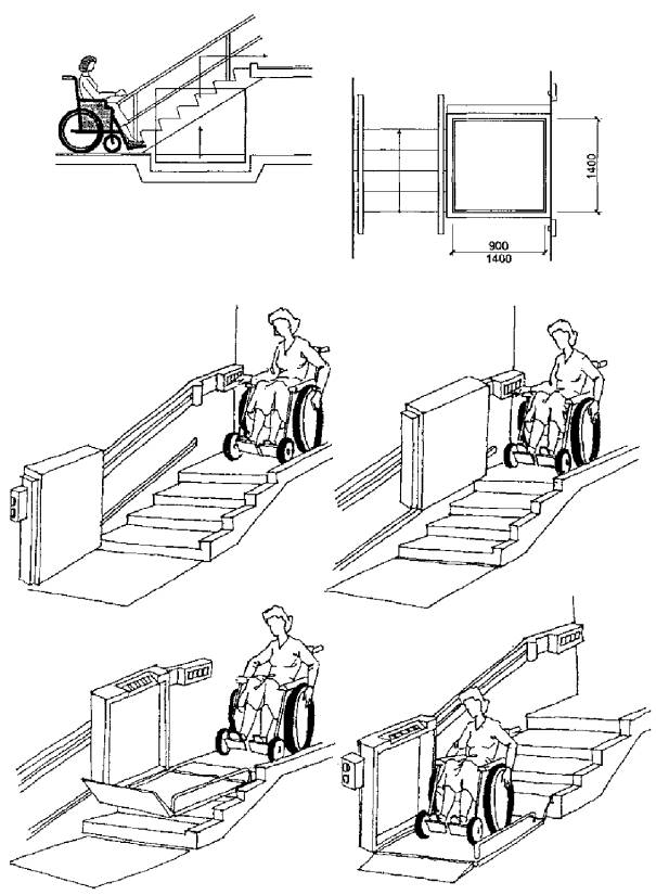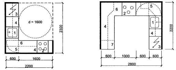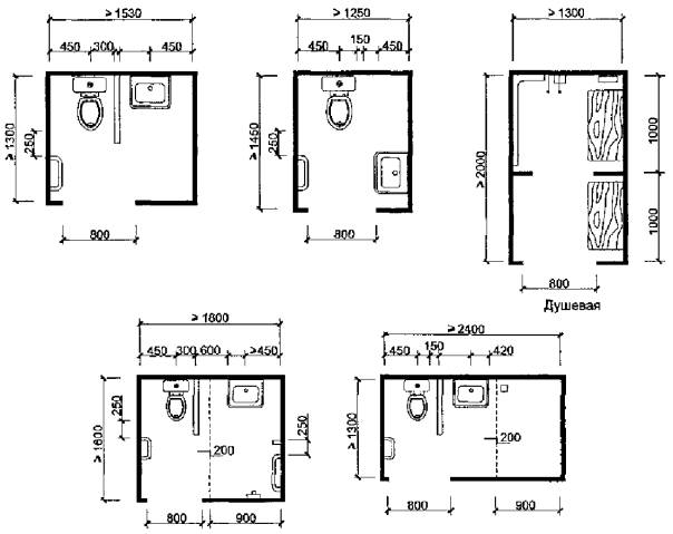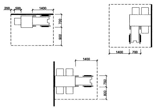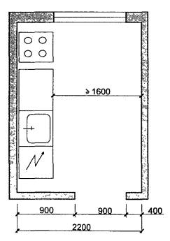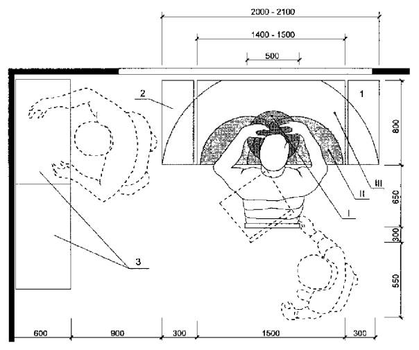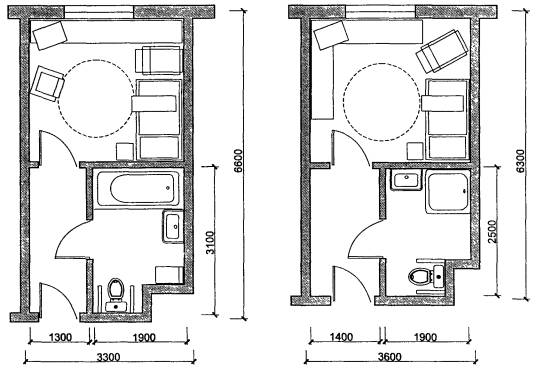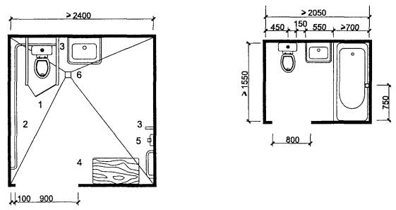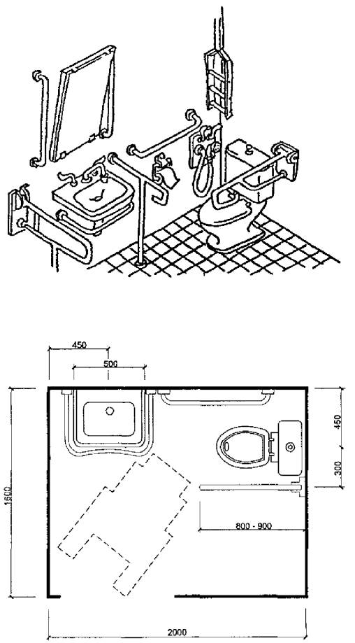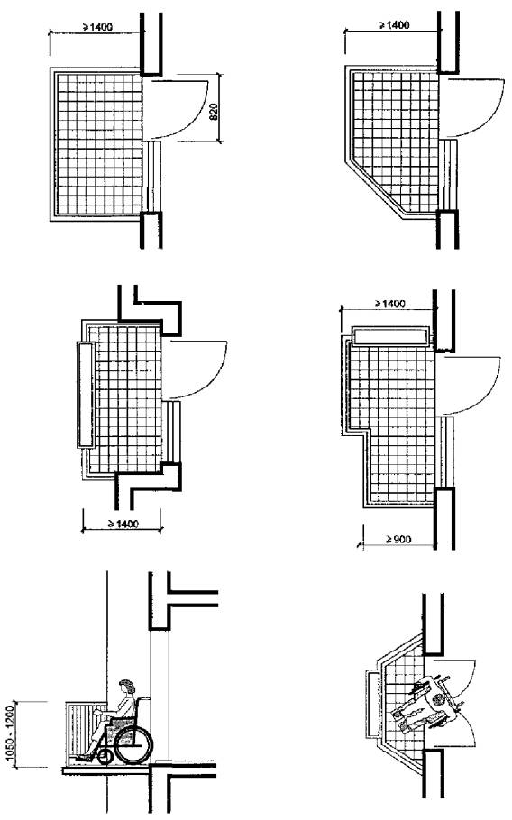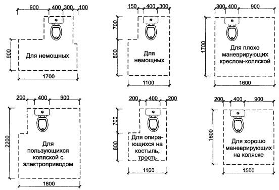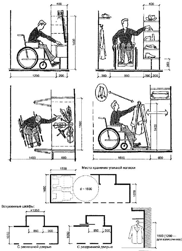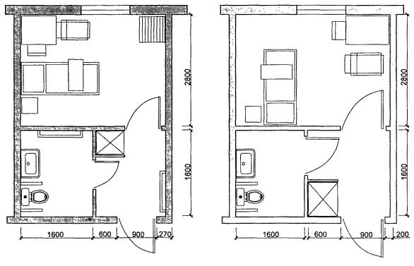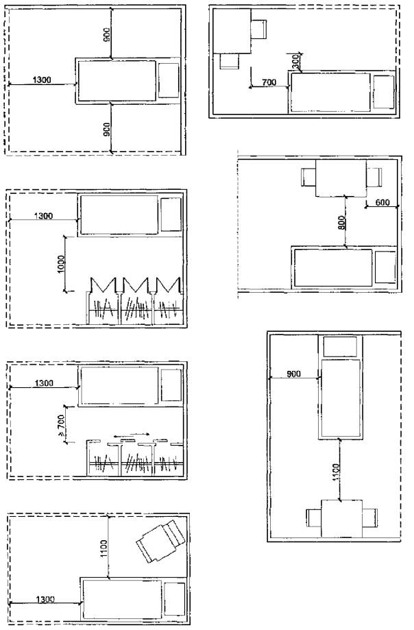 5.10 Для перехода с кресла-коляски на кровать необходимо предусматривать переходные приспособления (потолочные кольца, поворотные штанги, канатные дорожки, петли-держатели и др.) с креплением в конструкциях потолка и стен. 5.11 В ряде случаев бывает необходимо обеспечить двусторонний доступ кровати или исключительно лево-, правосторонний доступ, что следует учитывать при проектировании. В двухместных спальных помещениях кровати, как правило, должны располагаться раздельно. Помимо прочих удобств такая расстановка обеспечивает рациональное использование площади помещения. 5.12 Спальная (рисунок 5.1) должна, как правило, иметь непосредственный (либо через собственный холл) вход в санитарный узел. Прикроватное оборудование должно предусматривать столик (тумбочку) для установки телефона, местного освещения, хранения и выкладки на ночь мелких предметов, лекарств, устройств сигнализации и пр. Рекомендуется предусматривать дистанционное управление запиранием дверей, осуществляемое с двух пультов - инвалида и дежурного персонала. 5.13 Жилые комнаты (для супружеских пар, неполных семей с инвалидами и пр.) следует оборудовать индивидуальными шкафами для белья, одежды, обуви и других личных вещей. Индивидуальные шкафы для верхней одежды инвалидов следует предусматривать в передних квартир; такие шкафы должны быть либо встроенными, либо подвесными с тем, чтобы обеспечить подъезд к ним вплотную кресла-коляски. 5.14 Жилые помещения для инвалидов и других групп МГН не следует размещать смежно с помещениями с повышенным уровнем шума. 5.15 Площади номеров (рисунок 5.2) в зданиях рекреационных учреждений и гостиниц категории две звезды и ниже следует увеличивать не менее, чем на 20 % или расселять МГН в номерах увеличенной площади (более высокой категории либо заселяемых по другой формуле). 5.16 Площадь общей комнаты (гостиной) рекомендуется, как правило, принимать не менее: в одно-двухкомнатных квартирах - 18 м2; в трех-, четырехкомнатных квартирах - 20-22 м2. 5.17 Общие комнаты (гостиные), индивидуальные жилые комнаты (рисунок 5.2), жилые комнаты номеров и других жилых ячеек должны обеспечивать возможность подъезда на кресле-коляске к месту отдыха, к большинству элементов мебели (в особенности - к шкафам, сервантам, к столу и т.п.), к местам установки бытовой техники; особое значение имеет возможность подъезда к окну и наличие здесь видовой площадки для общения инвалида с внешней средой. 5.18 Мебель и оборудование, устанавливаемые в жилых комнатах, должны допускать возможность пользования ими без посторонней помощи. Заполнение мебелью помещений, которые используются инвалидами и другими категориями МГН, должно быть не более 40 % площади пола. Мебель в помещениях, используемых инвалидом на кресле-коляске, следует расставлять таким образом, чтобы в центре комнаты было свободное пространство, позволяющее осуществлять разворот кресла на 360°. Минимальная ширина проходов и проездов в жилых комнатах и кухне должна быть не менее 0,9 м. Углы мебели и иного штучного оборудования рекомендуется в целях предупреждения травматизма скруглять. Основную мебель желательно применять утяжеленной конструкции или крепить ее с тем, чтобы затруднить ее сдвиг наездом кресла-коляски. ВСПОМОГАТЕЛЬНЫЕ ПОМЕЩЕНИЯ5.19 В передних, прихожих, холлах (рисунок 5.3) квартир, жилых ячеек, номеров, п