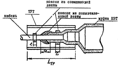 Определение требуемых длин отрезков ТУТ производится с учетом перекрытия наложенных на оболочку кабеля и муфту сэвиленовых поясков и с учетом 30 % продольной усадки трубок. Длина ТУТ рассчитывается по следующей формуле: