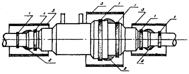Рис. 2. Расположение поясков и ТУТ в местах герметизации оболочки кабеля с окончанием полиэтиленовой муфты II. ПРОВЕДЕНИЕ МОНТАЖНЫХ РАБОТВосстановление полиэтиленовой оболочки кабеля при монтаже прямой соединительной муфты II.1. Восстановление полиэтиленовой оболочки в местах монтажа муфт выполняется с применением стандартных полиэтиленовых муфт и отрезков ТУТ (ориентировочный подбор ТУТ дан в таблице приложения). Перед сращиванием токопроводящих жил на каждый конец кабеля надвигают отрезки ТУТ, предварительно обезжиренные бензином Б-70, и отдельные части полиэтиленовой муфты, у которых с внешней стороны торцов цилиндрических окончаний и раструба (на среднем стыке) снята фаска под углом 30°. Необходимо обратить внимание на качество торцов ТУТ. Торцы должны быть ровными и обрезаны перпендикулярно оси-трубки, т.к. надрезы и заусенцы могут привести к разрыву трубки во время усадки. II.2. После монтажа сростка жил, восстановления поясной изоляции и экрана полиэтиленовую оболочку в местах установки муфты, а также стыкуемые участки муфты с внешней стороны обезжиривают бензином Б-70 и зачищают ножом. Затем муфту устанавливают над смонтированным сростком. II.3. В случае большого зазора (более 1,5 мм) между оболочкой кабеля и окончанием муфты последние осаживают до плотной посадки после прогрева горячим воздухом от открытого пламени. Осаживание производят стягивающим бандажом из резинового бинта. После полного остывания осаженных частей муфты их снова зачищают ножом. II.4. Для фиксации отдельных частей муфты между собой и с оболочкой кабеля на стыки наматывают один на другой 3-4 слоя полиэтиленовой ленты шириной, указанной в табл. 3. II.5. На оболочку кабеля, окончания муфты и в местах соединения частей муфты между собой по обе стороны от ранее намотанных слоев полиэтиленовой ленты без зазора накладывают пояски, сэвилена. Толщина каждого пояска сэвилена должна быть не менее 1,0 мм. II.6. Отрезки ТУТ надвигают на места, предназначенные для их усадки. Первоначально усаживают ТУТ на одном из стыков оболочки кабеля с окончанием муфты. Затем усаживают ТУТ в месте соединения частой муфты между собой. Далее усаживают ТУТ на стыке другого окончания муфты с оболочкой кабеля. II.7. Усадку ТУТ производят уморенным пламенем газовой горелки или паяльной лампы, при этом горелку (лампу) кругообразно перемещают вокруг трубки и от ее центра к одному из концов. После усадки одной половины трубки аналогично усаживают вторую ее половину. Особенно тщательно прогревают трубку в местах установки сэвилена. Прогрев продолжают до полной усадки ТУТ и активного выделения расплавленного герметика из-под ее торцов. При слабом нажатии на трубку защищенными пальцами руки под ней должно чувствоваться плавление герметика. На рис. 3 дана схема расположения поясков лент и отрезков ТУТ. Рис. 3. Расположение поясков лент и отрезков ТУТ на прямой соединительной муфте: 1 - пояски сэвилена; 2 - пояски полиэтиленовой ленты; 3 - отрезки термоусаживаемой трубки Особенности восстановления полиэтиленовой оболочки кабеля с гидрофобным заполнением при монтаже прямой соединительной муфты II.8. Восстановление полиэтиленовой оболочки кабеля с гидрофобным заполнением производится так же, как и при монтаже обычного кабеля (п. II.1) стандартными полиэтиленовыми муфтами и отрезками ТУТ. К особен