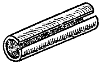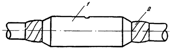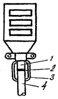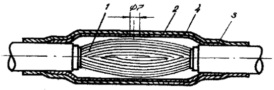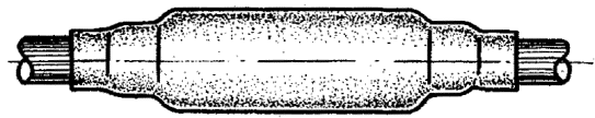 II.13. По сделанным отметкам делают два круговых и один продольный разрез и удаляют оболочку (при разделке кабеля емкостью свыше 300 пар для облегчения удаления оболочки рекомендуется ее предварительный прогрев). На кабеле ТППэп оболочку удаляют продольными полосками шириной 15-25 мм. На расстоянии 15 мм от среза оболочки обрывают экранную ленту и, отступив 5 мм от экрана, - поясную изоляцию. Во время разделки следует оберегать от повреждения экранную проволоку. II.14. Участок кабеля, освобожденный от оболочки, подтягивают к середине с небольшим поворотом против направления повива. Нитки, разделяющие повивы (пучки), обрезают или выкусывают, а жилы отделяют одна от другой. На рис.5 показана разделка кабеля. Рис. 5. Разделка кабеля II.15. Обе металлические полумуфты опорного каркаса протирают ветошью, смоченной в бензине, просушивают, устанавливают над вскрытый участком оболочки кабеля и скрепляют четырьмя слоями полиэтиленовой ленты, накладываемыми на цилиндрические окончания опорного каркаса с заходом на оболочку кабеля на 10-15 мм. Полумуфта каркаса с отверстием в центре должна устанавливаться вверху (рис.6). Рис. 6. Установка металлического каркаса: 1 - металлический каркас; 2 - слои полиэтиленовой ленты II.16. На установленный каркас надвигают ТУТ и усаживают ее. После остывания трубки в ней ножом прорезают отверстие над имеющимся отверстием в металлическом каркасе. На рис. 7 показана готовая к заливке муфта. Рис. 7. Готовая к заливке газонепроницаемая муфта: 1 - распушенный сердечник кабеля; 2 - металлический каркас; 3 - полиэтиленовая лента; 4 - термоусаживаемая трубка II.17. После заливки МГНМ отверстие в муфте временно перекрывают двумя слоями липкой пластмассовой ленты. После полного отвердения компаунда в муфте ленту удаляют. На рис. 8 показана смонтированная и залитая МГНМ. Рис. 8. Смонтированная и залитая МГНМ II.18. Детали для монтажа МГНМ, изготовленные в соответствии с конструкторской документацией, комплектуются в отдельную тару в соответствии с ТУ 45-80 (АХП 0.407.002 ТУ) Комплекты деталей и материалов для монтажа малогабаритных газонепроницаемых муфт (ЛГНМ)". Восстановление разнородных оболочек при соединении кабелей в полиэтиленовой и свинцовой (стальной) оболочках II.19. Для восстановления разнородных оболочек при монтаже муфт применяются: - свинцовая муфта (ТУ 45-76); - - свинцовая втулка с продольным разрезом (см. рис. 9), изготовленная из отходов кабеля ТТ. Внутренний диаметр свинцовой втулки должен соответствовать внешнему диаметру полиэтиленовой оболочки; - одна термоусаживаемая трубка (при монтаже кабелей емкостью до 300 пар); - две термоусаживаемые трубки (при монтаже кабеля емкостью свыше 300 пар); - сэвиленовая лента; - лента кабельной бумаги. Размеры ТУТ и свинцовых разрезных втулок приведены в табл.5. Рис. 9. Свинцовая втулка с продольным разрезом II.20. До начала монтажа сростка жил на стыкуемые кабели надвигают свинцовую муфту, а на кабель с полиэтиленовой оболочкой - термоусаживаемув трубку (одну или две), предварительно обезжиренную внутри бензином Б-70. II.21. На полиэтиленовую оболочку от места ее среза, на участке, равном длине свинцовой втулки, накладывают бандаж из 2-3 слоев кабельной бумаги. На бумажный бандаж устанавливают свинцовую втулку с продольным разрезом. Втулку подбивают деревянной киянкой до плотной посадки на полиэтиленовую оболо