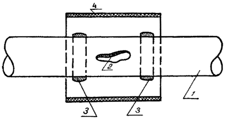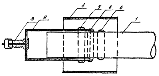 II.26. Перед введением кабеля в оконечное устройство на него надвигают одну ТУТ. II.27. Участок соединения вводной втулки оконечного устройства и полиэтиленовой оболочки кабеля для фиксации обматывают 4-5 слоями полиэтиленовой, ленты. Затем на этот участок надвигают и усаживают ТУТ. Усадку начинают с середины и далее в направлении к корпусу оконечного устройства, после чего усаживают вторую часть ТУТ. II.28. Схема соединения оболочки кабеля с вводной втулкой бокса показана на рис. 11. Оконечная заделка кабеля II.29. Оконечная заделка кабеля производится полиэтиленовыми колпачками соответствующих типоразмеров, имеющих в своем торце вентиль или без него. II.30. Герметизация стыка колпачка с полиэтиленовой оболочкой кабеля производится так же, как и герметизация одного из стыков монтируемой соединительной муфты. На рис. 12 показана схема установки и герметизации полиэтиленового колпачка. Рис. 11. Схема соединения оболочки кабеля с вводной втулкой кабельного бокса: 1 - вводная втулка; 2 - участок обмотки полиэтиленовой лентой; 3-термоусаживаемая трубка; 4-кабель Рис. 12. Схема установки и герметизации полиэтиленового колпачка: 1 - кабель с полиэтиленовой оболочкой; 2 - полиэтиленовый колпачок; 3- вентиль; 4 - термоусаживаемая трубка; 5 - подоски сэвилена; 6- обмотка полиэтиленовой лентой Демонтаж муфт II.31. Перед вскрытием полиэтиленовой муфты участки герметизации необходимо прогреть горячим воздухом от газовой горелки или паяльной дампы. На прогретых участках сделать продольный разрез ТУТ ножом. Снять ТУТ и сдвинуть со сростка части муфты. После устранений повреждения установить части муфты над сростком. Стыки частей муфты между собой и оболочкой кабеля тщательно зачистить от остатков сэвилена и заварить путем наплавления полиэтиленовой ленты под стеклолентой. II.32. При демонтаже муфты, смонтированной на стыке кабелей в разнородных оболочках, распаивает стыки конусов свинцовой муфты и при необходимости делают продольный разрез. Муфту сдвигают в сторону или снимают со сростка. При последующем восстановлении наружной оболочки свинцовую муфту устанавливают на прежнее место и производят пайку продольного разреза и конусов муфты к свинцовой (стальной) оболочке кабеля и к свинцовой втулке. Во время распайки и лайки ТУТ следует защищать стеклолентой. Ремонт оболочек II.33. Ремонт полиэтиленовых оболочек кабелей термоусаживаемыми трубками возможен только в том случае, когда повреждение оболочки произошло недалеко от конца кабеля. Для проведения ремонта необходимо зачистить участок повреждения оболочки, наложить рядом с поврежденным участком по одному пояску сэвилена и над ними установить и усадить термоусаживаемую трубку (см. рис. 13). Рис. 13. Ремонт полиэтиленовой оболочки: 1 - кабель с полиэтиленовой оболочкой; 2 - повреждение кабеля: 3 - подоски сэвилена: - термоусаживаемая трубка III. КОНТРОЛЬ КАЧЕСТВА СМОНТИРОВАННЫХ МУФТIII.1. Контроль герметичности смонтированных муфт и смонтированных участков линий производится в соответствии с главой 12 "Общей инструкции по строительству линейных сооружений ГТС" (М., "Связь", 1978). III.2. Контроль качества смонтированных муфт на кабелях с гидрофобным заполнением производится внешним осмотром и по результатам электрических измерений характеристик линий. IV. ТЕХНИКА БЕЗОПАСНОСТИIV.1. Монтаж кабелей должен производить