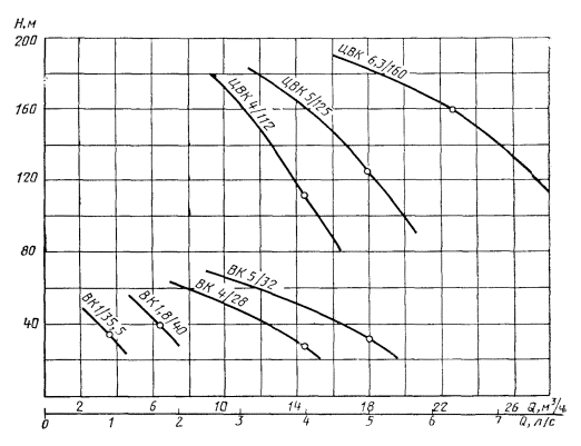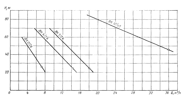 1. Основные параметры указаны при работе насосов на воде с температурой 293 К (20 °С). 2. Для вихревых насосов по табл. 2 основные параметры расчетные и могут уточняться по мере освоения соответствующих типоразмеров. 3. Производственные допустимые отклонения по всей рабочей части характеристики: подача ± 8 %, напора + 6 %. 4. Допустимый кавитационный запас установлен при коэффициенте кавитационного запаса равного 1,15 для центробежно-вихревых и равного 1,1 для вихревых насосов. 5. Значение КПД приведено для оптимального режима в пределах рабочей части характеристики. Производственный допуск на КПД минус 3 % от указанного в табл. 2 и 3. 6. Масса вихревых насосов указана для основного исполнения ВК-А. Для других исполнений масса указывается в технических условиях на насосы конкретных типов. 2.4. Допускается работа насосов с электроприводом частотой тока 60 Гц. При этом значения основных параметров должны быть указаны в технических условиях и эксплуатационной документации на насосы конкретных типоразмеров. 2.5. Условное обозначение насосов должно соответствовать структурной схеме, приведенной в приложении 2. ПРИЛОЖЕНИЕ 1Справочное РАБОЧИЕ ЧАСТИ ХАРАКТЕРИСТИК НАСОСОВОбласть работы насосов