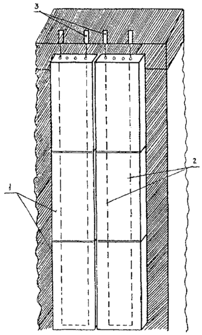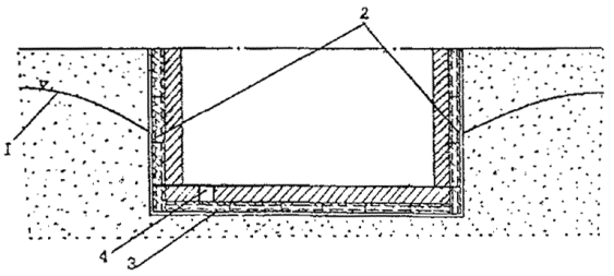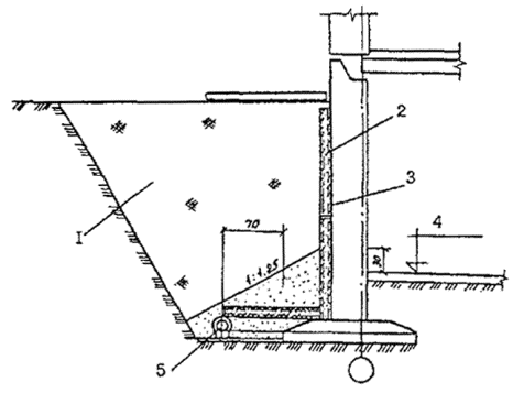 2.4. Материалы, применяемые для изготовления плит, должны отвечать требованиям следующих ГОСТов и ТУ: Цемент - ГОСТ 10178-85* Керамзитовый гравий и песок - ГОСТ 9757-90 Плотные заполнители - ГОСТ 8268-82* - ГОСТ 10260-82* - ГОСТ 8267-82* Полистирол вспенивающийся, суспензионный с поверхностной обработкой - ТУ 6-05-1905-81 2.5. Марка цемента должна быть не ниже 400. 2.6. Марка керамзитового гравия должна быть не ниже 500, фракции керамзита от 0,1 до 10 мм. 2.7. Размер частиц плотного заполнителя должен быть 3-10 мм. 2.8. Следует применять полистирол марки ПСВ-75С или ПСВ-76С. 2.9. Состав керамзитобетона - 1:2,5; 1:3 (по массе). Водоцементное соотношение в зависимости от влажности применяемого керамзита принимается равным от 0,45 до 0,7. 2.10. Состав пористого бетона на плотных заполнителях (по массе) 1:6; 1:7; 1:8. Водоцементное соотношение - от 0,35 до 0,46 в зависимости от влажности заполнителя. 2.11. Отпускная прочность бетона плит в момент отгрузки должна быть не менее 4,5 МПа. 2.12. Прочность на сжатие пенополистирольных плит при 10% линейной деформации - не менее 0,03 МПа. 2.13. Плотность пенополистирольных плит должна составлять 18- 20 кг/м3. 2.14. Коэффициент фильтрации плит составляет: - из пористого бетона и керамзитобетона от 350 до 500 с/сут. - из пенополистирола - не менее 500 м/сут. 3. ПРАВИЛА УКЛАДКИ ФИЛЬТРУЮЩИХ ПЛИТ3.1. Укладка фильтрующих плит производится в соответствии с проектом, определяющим конструкцию дренажного сооружения, и проектом производства работ. 3.2. Укладка плит пристенного дренажа производится совместно с устройством сопутствующего трубчатого дренажа, в зависимости от расчетного уровня грунтовых вод по отношению к полу подвала сооружения: - если расчетный уровень грунтовых вод расположен ниже пола подвала сооружения дренаж выполняется из вертикально установленных у стены фильтрующих плит и сопутствующего трубчатого дренажа, засыпаемых песком с коэффициентом фильтрации 5 м/сут на высоту не менее 30 см над трубчатым дренажом (рис. 2, 3); - если расчетный уровень грунтовых вод расположен выше пола подвала сооружения, дренаж выполняется с дополнительной прокладкой фильтрующих керамзитобетонных плит через 5-15 м (расстояние должно быть отражено в проекте) от стены сооружения до сопутствующего трубчатого дренажа с уклоном 0,2-0,5% (рис. 4) Возможно сочетание пристенного дренажа с пластовым (рис. 5, 6). 3.3. Установку первого снизу ряда плит следует производить на 30 см ниже пола подвала сооружения. Трубчатый дренаж устраивается ниже пола подвала не менее чем на 50 см. 3.4. Укладку плит пристенного дренажа производить в направлении от внутренних углов здания к внешним. Рис. 1 Конструктивная схема фильтрующей плиты ( к табл. 1) Рис. 2. Схема пристенного дренажа здания с сопутствующим дренажом: 1 - местный грунт; 2 - фильтрующие керамзитобетонные или пенополистирольные плиты; 3 - гидроизоляция по проекту; 4 - пол подвала; 5 - дренажная труба Рис. 3. Схема дренажа подземных пешеходных переходов: 1 - песок с коэффициентом фильтрации (Кф)³5 м/сут; 2 - местный грунт; 3 - гидроизоляция по проекту; 4 - дорожная одежда; 5 - фильтрующие плиты; 6 - обмазочная гидроизоляция; 7 - дренажная труба Рис. 4. Схема пристенного дренажа здания с сопутствующим кольцевым дренажом: 1 - местный грунт; 2 - фильтрующие керамзитобетонные плиты; 3 - гидроизоляция по проекту; 4 - пол подвала; 5 - дренажная труба Рис. 5. Схема дренажа каналов теплосети из коллекторов (здес