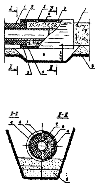 Примечание. Обозначения параметров см. в рис. 2. 3.2. Для обеспечения свободных температурных перемещений на углах поворотов трассы и в местах устройства гибких компенсаторов трубопроводы следует прокладывать в непроходных каналах. Допускается на углах поворотов трассы и при устройстве компенсаторов прокладка в непроходных каналах, образованных пенополистирольными плитами, установленными между трубами и сбоку от них с прикрытием сверху от попадания грунта аналогичной плитой, подрезанной по требуемому размеру. 3.3. Этапы бесканальной прокладки тепловых сетей с битумоперлитовой изоляцией следующие (рис. 3): 1) рытье траншей; 2) устройство сопутствующего дренажа и песчаной постели толщиной 100-150 мм (рис. 3а); 3) раскладка и монтаж труб, сварка стыков; 4) нанесение защитного покрытия, установка скорлуп, гидроизоляция стыков с термоусадкой муфт или намоткой стеклоткани, пленки ПИЛ (рис. 3б); 5) устройство неподвижных и скользящих опор; 6) устройство песчаной обсыпки теплопроводов (рис. 3в); 7) засыпка траншеи (рис. 3г); 6) устройство пористого слоя и дренажа - при пятитрубной прокладке с дренажом (рис. 3д). 3.4. Тепловые сети с битумоперлитовой изоляцией в песчаных и глинистых грунтах можно прокладывать бесканальным способом, если постоянный уровень грунтовых вод ниже уровня прохождения теплотрассы. 3.5. При бесканальной прокладке теплопроводов в сухих песчаных грунтах (естественная влажность не более 5 %) с коэффициентом фильтрации Кф £ 5 м/сут никаких дополнительных устройств по защите битумоперлитовой изоляции от увлажнения не требуется. 3.6. В случае бесканальной прокладки теплопроводов во влажных глинистых и песчаных грунтах рекомендуется создать пористый песчаный слой с коэффициентом фильтрацию Кф £ 5 м/сут и попутный дренаж. Дренаж устраивают с использованием перфорированных труб диаметром не менее 150 мм с двухслойном песчано-гравийным фильтром или трубофильтром. 3.7. Рытье траншей выполняется согласно проекту, без нарушения естественной структуры грунта. Подсыпку и выравнивание дна траншей производят песком. Рис. 3. Последовательность работ по бесканальной прокладке тепловых сетей (см. раздел 3.3). Условные обозначения трубопроводов - как на рисунке 2 3.8. Создание пористого песчаного слоя в глинистых и водонасыщенных грунтах начинают с устройства песчаной постели толщиной 150 мм. После укладки труб и изоляции стыков производят дополнительную подсыпку песка. Сначала песок подсыпают на высоту изолированной трубы с тщательной подбивкой пазух, затем - до высоты 150 мм над верхом изоляции. 3.9. В насыпных, рыхлых, торфянистых и других слабых грунтах с несущей способностью меньше 50 кПа (0,5 кгс/см) песчаную постель укладывают на слой трамбованной щебенки, гравия или тощего бетона толщиной не менее 100 мм. Проектом устанавливается тип основания под песчаную постель, затем после разрытия траншей тип основания уточняют в зависимости от вида грунта. 3.10. До укладки труб в траншею следует устранить все повреждения битумоперлитовой изоляции. Наружные трещины шириной до 5 мм заливают горячим битумом. Отколы и другие повреждения изоляции необходимо расчистить до металлической трубы, затем это место изолируют с помощью битумоперлитовых скорлуп, устанавливаемых на горячей битумной мастике (битумно-пропиленовой или битумно-каучуковой). 3.11. Отремонтированн