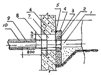 где tмонт. - температура теплопровода в момент монтажа, °С; L - расстояние между двумя пусковыми компенсаторами (L£Lmах). 2.36. После засыпки предварительно нагретых теплопроводов перемещения их отсутствуют (за исключением участков естественной компенсации) и температурные перепады изменяют лишь напряжения в теплопроводах в пределах допустимых значений. 2.37. При использовании метода предварительного нагрева теплопроводов особое внимание обратить на следующее: - примыкающие к врезкам в существующие или проектируемые теплопроводы прямолинейные участки должны иметь длину не более 30 м, при более длинных участках у врезок необходимо устанавливать на них неподвижные опоры на расстоянии не более 12 м от врезки; - на ответвлениях должны свободно обеспечиваться поперечные перемещения путем установки эластичных прокладок. 2.38. При необходимости прокладки тепловых сетей с пенополиуретановой изоляцией в полиэтиленовой оболочке строительные конструкции (камеры, камеры-павильоны, проходные и непроходные каналы, прокладки теплопроводов в футлярах и щитовых тоннелях) должны применяться как и при канальной прокладке. 2.39. Сопряжение бесканальных участков теплопроводов с каналом должно осуществляться путем устройства торцевой стенки с сальниковыми уплотнениями вокруг изолированных теплопроводов (см. рис. 4) или песчаной обсыпкой. 2.40. Проход теплопроводов сквозь стенки камер и фундаменты зданий осуществляется с помощью установки специальных резиновых гильз с последующим бетонированием (бетон В 3,5) в строительной конструкции (см. рис. 5 и 6). 2.41. При невозможности выдержать нормы, предусмотренные СНиП 2.04.07-86", пересечение теплопроводов бесканальной прокладки с газопроводом, водопроводом, электрическими кабелями мощностью до 35 кВ необходимо выполнять по типовым чертежам альбома Мосинжпроекта СК 3105-88 "Конструкции пересечения теплосети с подземными коммуникациями". 2.42. Конструкции железобетонных неподвижных опор для бесканальной прокладки тепловых сетей должны разрабатываться по индивидуальным чертежам на необходимое усилие, определяемое расчетом с учетом местных грунтовых условий. 2.43. Минимальную глубину заложения труб с теплоизоляцией из ППУ в полиэтиленовой оболочке в земле следует принимать не менее 0,5 м вне пределов проезжей части и 0,6 м - в пределах проезжей части, считая до верха теплоизоляции. Допускаемая расчетная глубина заложения теплоизолированных труб должна составлять ориентировочно для диаметров (стальных труб и полиэтиленовых оболочек) до 76´160 мм - 3,1 м, до 159´250 мм - 3,7 м, до 530´710 мм - 3,6 м, до 1020´1200 мм - 2,4 м. Рис. 4. Конструкция сопряжения бесканальной прокладки с канальной: 1 - обратный трубопровод; 2 - подающий трубопровод; 3 - 2 слоя изола на битумной мастике; 4 - бетонная подготовка В 7,5; 5 - прокладка марки Вилатерм 40¸50 мм (ТУ 6-06-221-762-84); 6 - теплоизоляция из пенополиуретана; 7 - бетон класса В 15; 8 - 2 слоя изола на битумной мастике Рис. 5. Конструкция прохода теплопроводов через стены камер, камер-павильонов: 1 - стена камеры; 2 - заводская изоляция труб; 3 - граница заводской изоляции труб; 4 - песчаное основание; 5 - ленточная усадочная муфта; 6 - резиновая гильза; 7 - герметизация стыка прокладкой Вилатерм диаметром 40-50 мм; 8 - заделка зазора гильзы; 9 - гильза; 10 - заделка бетоном В 3,5