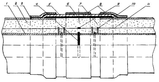 Рис. 6. Конструкция прохода теплопроводов сквозь стены фундамента зданий: 1 - изолированный теплопровод; 2 - резиновая гильза; 3 - заделка бетоном В 3,5; 4 - стенка из железобетона; 5 - герметизация; 6 - фундамент здания; 7 - проем; 8 - гильза из тонколистовой стали; 9 - теплоизоляция из минеральной ваты; 10 - покровной слой При учете транспортной нагрузки НК-80 допускаемая глубина заложения должна быть уменьшена в среднем в 1,6 раза. Примечание. При необходимости контрольных расчетов глубин заложения теплопроводов с изоляцией из ППУ в ПЭ оболочке для конкретных условий прокладки расчетное сопротивление пенополиуретана следует принимать 0,1 МПа, полиэтиленовой оболочки - 1,6 МПа. 2.44. При необходимости подземной прокладки теплопроводов с теплоизоляцией из ППУ в ПЭ оболочке на глубине более допустимых их следует прокладывать в каналах (тоннелях). 2.45. Для теплогидроизоляции стыковых соединений изолированных ППУ труб между собой и с фасонными изделиями и элементами следует применять конструкцию стыка с полиэтиленовой термоусаживающейся муфтой, полиэтиленовыми термоусаживающимися манжетами и заливкой смесью ППУ (рис.7). Примечание. Допускается использование других конструкций теплогидроизоляции стыков изолированных ППУ труб, отвечающих требованиям стандарта JSOЕN489. 2.47. Система ОДК должна содержать: - не менее 2-х проводников-индикаторов, закладываемых в пенополиуретановую теплоизоляцию труб диаметром не менее 1,0 мм; - прибор для фиксирования увлажнения теплоизоляции; - прибор для определения координат места (по длине трубопровода) возникновения увлажнения теплоизоляции (инвентарно); - узлы ввода-вывода проводников-индикаторов из теплоизоляции труб; - сопутствующие подключающие устройства, кабели и пр. Рис. 7. Конструкция теплогидроизоляции стыка труб с теплоизоляцией из пенополиуретана в полиэтиленовой оболочке: 1 - стальная труба; 2 - теплоизоляционный слой ППУ; 3 - полиэтиленовая оболочка изоляции; 4 - сварной шов стальных труб; 5 - полиэтиленовая термоусаживающаяся муфта; 6 - отверстие в муфте для заливки смеси ППУ с подслоем герметика; 7 - заливочный ППУ; 8 - термоусаживающиеся манжеты с подслоем герметика; 9 - соединение проводников-индикаторов системы ОДК; 10 - опора-кронштейн из полиэтилена для проводников-индикаторов; 11 - проводники-индикаторы системы ОДК 2.48. Установку фиксирующих приборов системы ОДК следует производить в соответствии с проектом, как правило, в помещениях ЦТП, камерах-павильонах, диспетчерских пунктах и др. Примечание. Допускается установка фиксирующих приборов системы ОДК в специальных павильонах, сооружаемых на трассе теплопровода. 3. ТРАНСПОРТИРОВКА И ХРАНЕНИЕ ИЗОЛИРОВАННЫХ ТРУБ И ДЕТАЛЕЙ3.1. Доставка на строительную площадку теплоизолированных труб диаметром до 300 мм должна производиться автотранспортом с удлиненным прицепом, диаметром 400-1000 мм - специально оборудованным автотранспортом. 3.2. Транспортировку изолированных труб и деталей следует выполнять при температуре до минус 18°С. 3.3. Разгрузку изолированных труб и деталей диаметром до 150 мм следует производить с использованием траверс и мягких полотенец или строп, располагаемых на трубах на 1/3 по их длине, диаметром 300 - 1000 мм - с использованием полотенец или строп, в том числе с захватом по неизолированным концам стальных труб. 3.4. Погрузочно-разгрузочные работы с и