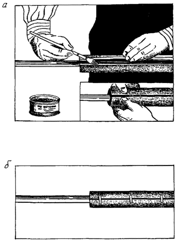 Рис. 5 (а, б). Для изоляции углов поворота 45°, с помощью стандартной угловой матрицы (стусла) и специальных разрезных ножей разрезают оболочку под углом 45°, надевают с двух сторон на колено, стыки проклеивают и плотно сжимают или скрепляют с помощью зажимов: а - установка изоляции на трубу, нанесение клея на стыки; б - сжатие стыков после подсушки клея Для скрепления краев разрезанной оболочки можно использовать специальные металлические или пластмассовые скобы-зажимы с загнутыми вверх концами или снабженные зазубринами (рис. 7 а, б). 3.10. Для удержания и подвески изолированных труб, в частности горячего водоснабжения, рекомендуется использовать с целью снижения теплопотерь специальные широкие бандажи (по длине не менее 8-10 см) с прикрепленными к ним тягами из металла диаметром 5 мм или более, закрепляемыми к потолкам или выступающим деталям зданий. Так как бандажи устанавливаются на слой изоляции, а не крепятся к металлу труб, способ не дает излишних теплопотерь. В этом случае следует избегать излишнего сжатия и деформации пенополиэтиленовой изоляции путем увеличения поверхности соприкосновения или установки дополнительной пенополиэтиленовой оболочки. 3.11. Трубы больших диаметров и сосуды цилиндрической формы можно изолировать с применением плоских лент, наматываемых под углом с нахлестом с таким расчетом, чтобы получить требуемую толщину изоляции. Рулонный материал предварительно нарезают на полосы шириной 20-25 см, нахлест полос друг на друга должен быть не менее 4-5 см. Намотка может проводиться как вручную, так и с применением намоточных устройств. Слои изоляции могут закрепляться приклеиванием или фиксацией бандажами, проволочными скрутками диаметром 0,5-2 мм или клеящей лентой. Закрепление следует проводить через каждые 30-50 см и на концах изолируемых трубных заготовок. Целесообразно использовать ленты с толщиной, равной требуемой толщине пенополиэтиленовой изоляции. Возможно использовать ленты с гофрированной поверхностью, создающие технологические пустоты, которые улучшают теплозащиту без увеличения материалоемкости. Толщина изоляции всех фасонных участков должна быть не меньше, чем линейных участков. Рис. 6 а. Изоляция муфтового соединения. На оболочке делают внутренний вырез, облегающий муфту